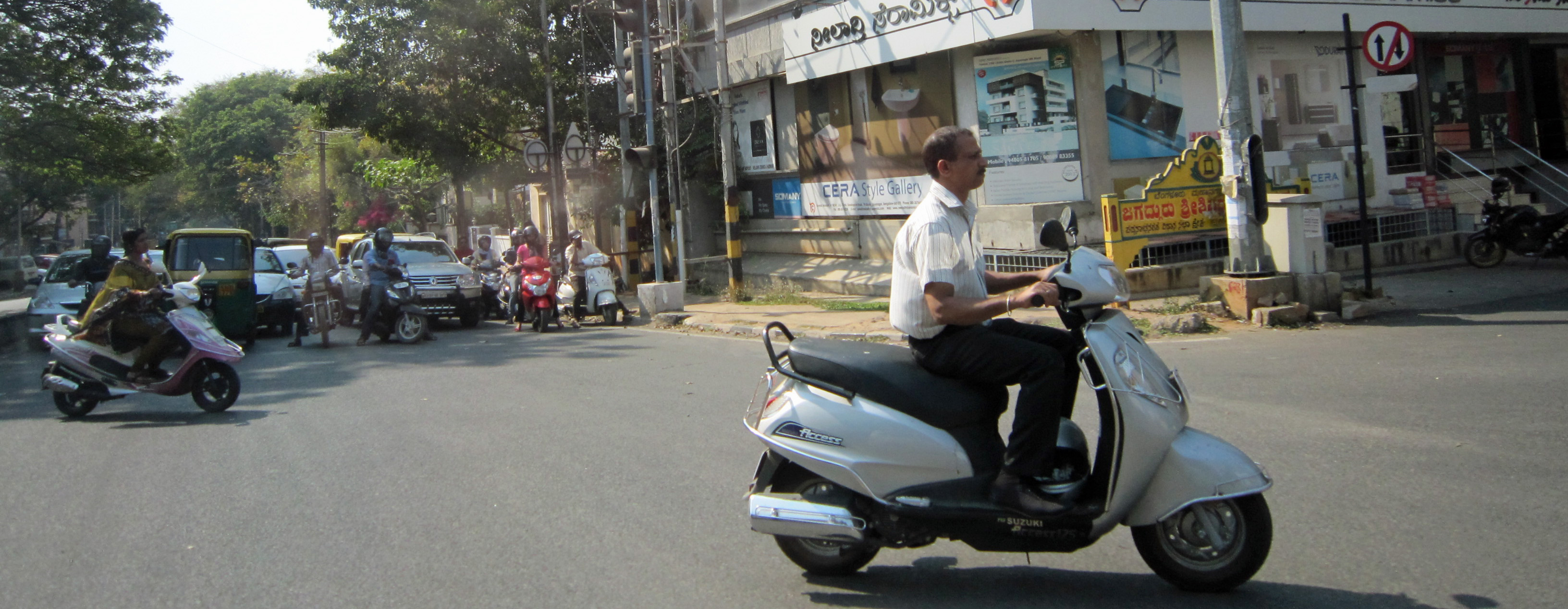 Vor einer der wenigen Ampeln kommen wir zum Stehen. Rund um uns herum schieben sich Motorräder in die noch freien Lücken zwischen den Autos durch. Berührungsängste scheint keiner zu haben. Dicht neben uns schlängelt sich eine Frau auf einem Roller in buntem Sari vorbei. Unter ihrem Sturzhelm schaut ein langer, pechschwarzer Zopf hervor, auf dem eine kunstvoll geflochtene Blumengirlande befestigt ist.