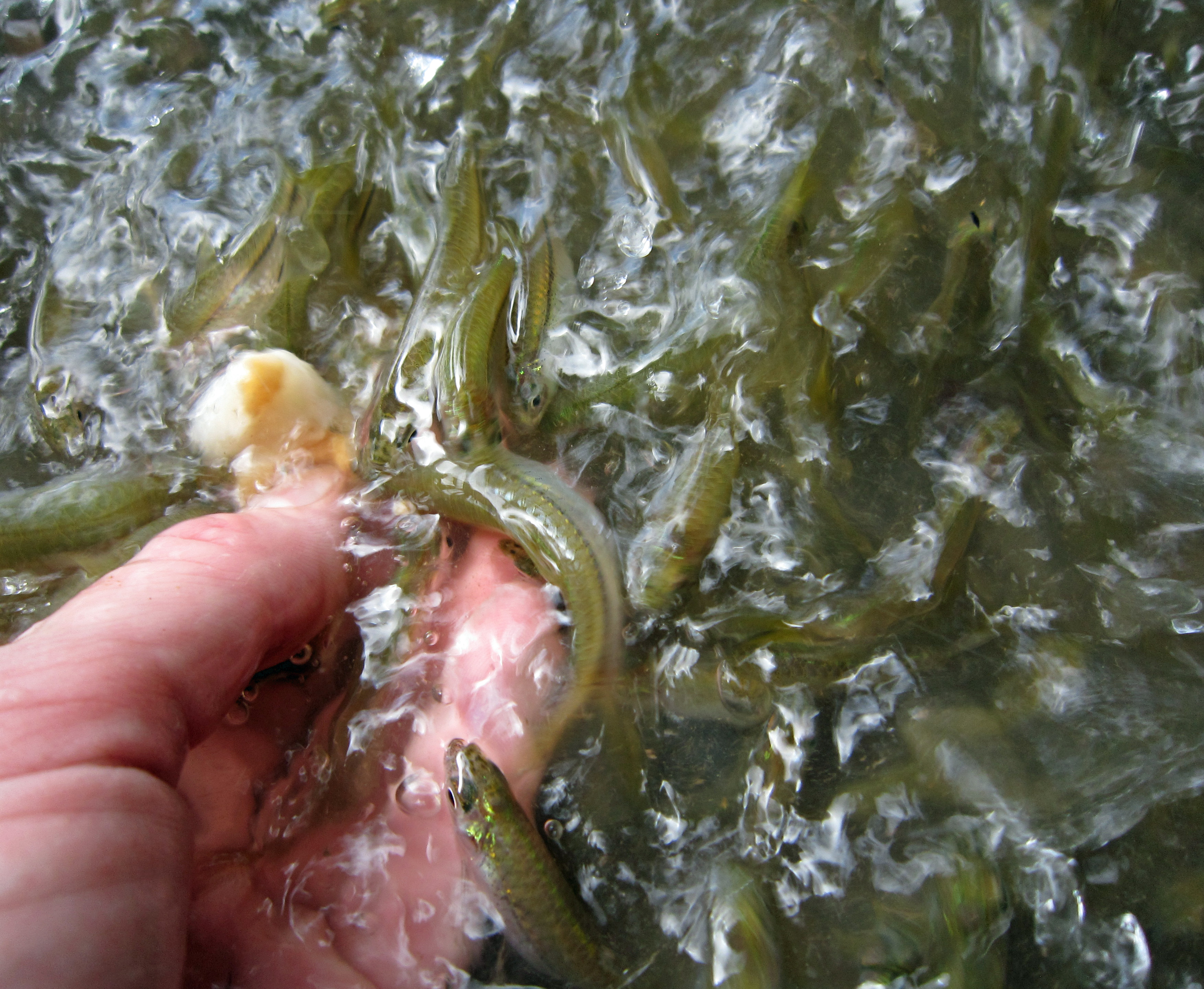 Der Guide streckt mir ein kleines Stück Brot entgegen und deutet mir, es auch zu probieren soll. Vorsichtig halte ich meine Hand in das warme Wasser. Hier am Ufer ist es so flach, dass ich meine Hand gar nicht komplett eintauchen kann. Sofort sind Brot und Hand von kleinen Fischen umringt. Im ersten Moment bin ich versucht, die Hand sofort wieder raus zuziehen, so ungewohnt ist das Gefühl der kleinen Mäuler, die an meinen Fingern knabbern. Die kleinen Dinger scheinen überhaupt keine Scheu zu kennen: einige springen sogar kurz auf meine Handfläche, um ein Stück Brot zu erhaschen. Ich bin völlig fasziniert von dem Schauspiel und enttäuscht, als das Brot viel zu schnell abgenagt ist. Gleich probiere ich es mit einem weiteren Stück und schon sammeln sich wieder die kleinen, glitschigen Körper um meine Hand und nagen an Brot und Fingern. Fast könnte man einfach die Hand schließen und die Fische einfangen.