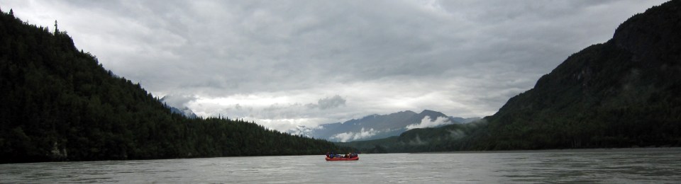 Der Regen hat mittlerweile aufgehört und wir lassen unser Boot von der Strömung treiben. Bis auf das Rauschen des Flusses ist es still. Rechts und links ragen Berghänge aus dem Wasser, teils grün mit Tannen bewachsen, felsig in den höheren Regionen. Die Wolkendecke vor uns reißt etwas auf und lässt das blaue Eis des Gletschers auf einer Bergflanke vor uns durchschimmern. Neben mir deutet Ursula auf das Wasser vor uns: ein Seehund streckt seinen Kopf aus dem Wasser und beäugt neugierig das Boot mit seinen Insassen, und taucht auch schon wieder elegant unter. Kurz darauf zieht ein Seeadler seine Kreise über dem breiten Fluss.