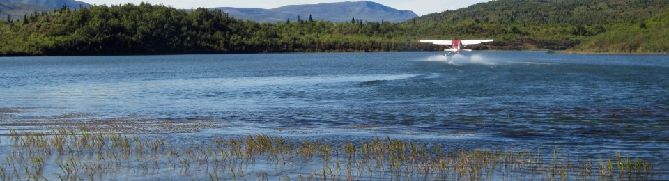 Kurz bevor die grünen Hügel in die kahle Wüste übergehen liegt unter uns ein kleiner, einsamer See, auf die unser Pilot nun zusteuert. In den Propellerlärm mischt sich noch ein hohes Surren und ich kann das andere Flugzeug erkennen, das schon am Ufer des Sees liegt. Kleine Ameisen stehen im Wasser und befördern in einer Menschenschlange das Gepäck ans Ufer. Unter unserer Kufen spritzt das Wasser auf und wir gleiten Richtung Ufer. Nun erschließt sich mir auch, warum unser Pilot Gummistiefel bis zu den Hüften trägt: er steigt ins Wasser und zieht das kleine Flugzeug die letzten Meter Richtung Ufer.