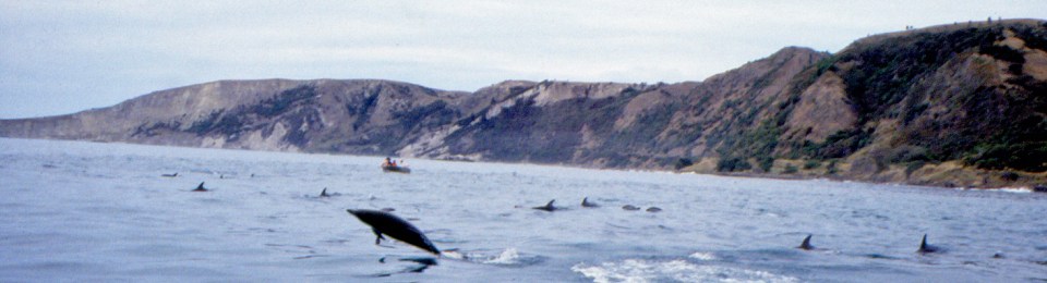 Schon nach kurzer Fahrt – die grünen Hügel der Bucht sind noch gut zu erkennen – tauchen schon die ersten schlanken Körper mit schwarzem Rücken und dem leuchtend weißen Bauch vor uns auf. Die eingeschwärzte Schnabelspitze und die dunklen Augen verleihen ihrem Blick etwas Schelmisches und fast sehen sie aus wie die Clowns der Meere. Und es werden immer mehr. Das Boot wird langsamer bis es schließlich im ruhigen Wasser treibt. Laut unserem Kapitän sind wir mittlerweile von mehr als hundert Dusky Dolphins eingekreist, sie tauchen unter dem Boot hinweg, schauen neugierig aus dem Wasser oder vollführen ausgelassene Sprünge. Ich weiß gar nicht, in welche Richtung ich zuerst schauen soll.