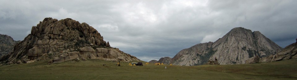 Ich sitze hoch oben auf einem der markanten Felsen in den Ausläufern der Wüste Gobi, am Fuße derer wir heute unser Lager aufgeschlagen haben. Direkt unter mir die gelben Punkte der Zelte, aber zu weit weg, um die Stimmen der Gestalten, die sich dazwischen bewegen, bis zu mir dringen zu lassen.