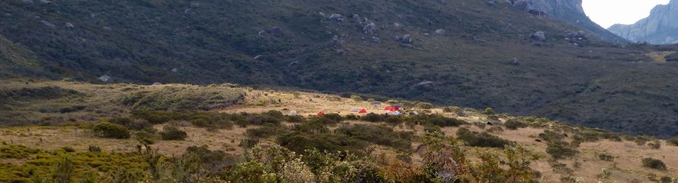 Es ist schon dunkel, ich kann die ersten Sterne am klaren Nachthimmel erkennen und mein Atem hinterlässt kleine Wölkchen in der kühlen Bergluft. Vor mir sehe ich die beiden Hütten, in denen gekocht wird. Grobe Steinmauern mit einem spitzen Dach aus Brettern, notdürftig gedeckt mit dünnen Zweigen und Ästen. Stimmen dringen zu mir herüber. Hinter mir erheben sich die Mauern des Andringitra Massivs und die wenigen erleuchtete Zelte im Vordergrund kauern sich winzig in den Schatten der Steilwände.