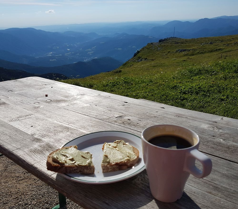 Für mich geht sich heute nur eine schnelle Kaffee-Pause aus, da die Hütte voll ist und das Wetter traumhaft. Der Strom der Wanderer, die verschwitzt bei uns ankommen und Sonne und Aussicht im Garten genießen, reißt für die nächsten Stunden nicht ab.