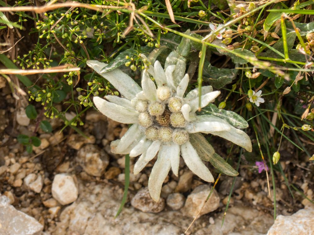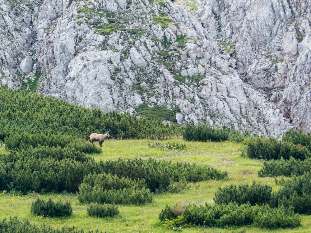 Am späteren Nachmittag ist es ruhiger und ich laufe langsam barfuß über die Wiesen vor der Hütte. Das Gras ist kühl, kitzelt meine Fußsohlen und ich muss aufpassen, dass ich nicht auf eine der Bienen trete, die auch hier oben fleißig unterwegs sind. Ein paar Edelweiß verstecken sich zwischen den Grasbüscheln. Die Stille hält wieder Einzug. Nur vereinzelt hört man die Stimmen von Wanderern, die schon wieder unterwegs ins Tal sind. Der Berg gehört nun den Gämsen, die sich langsam wieder blicken lassen.