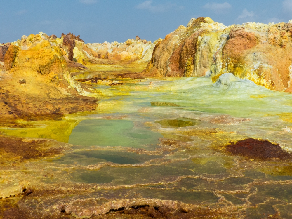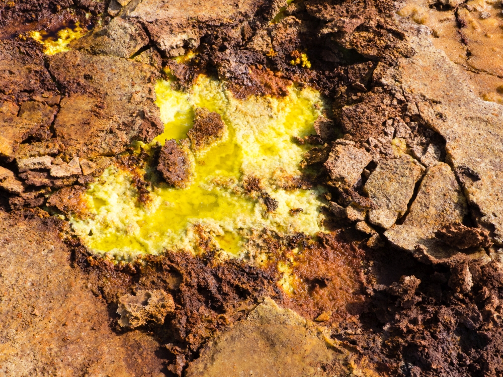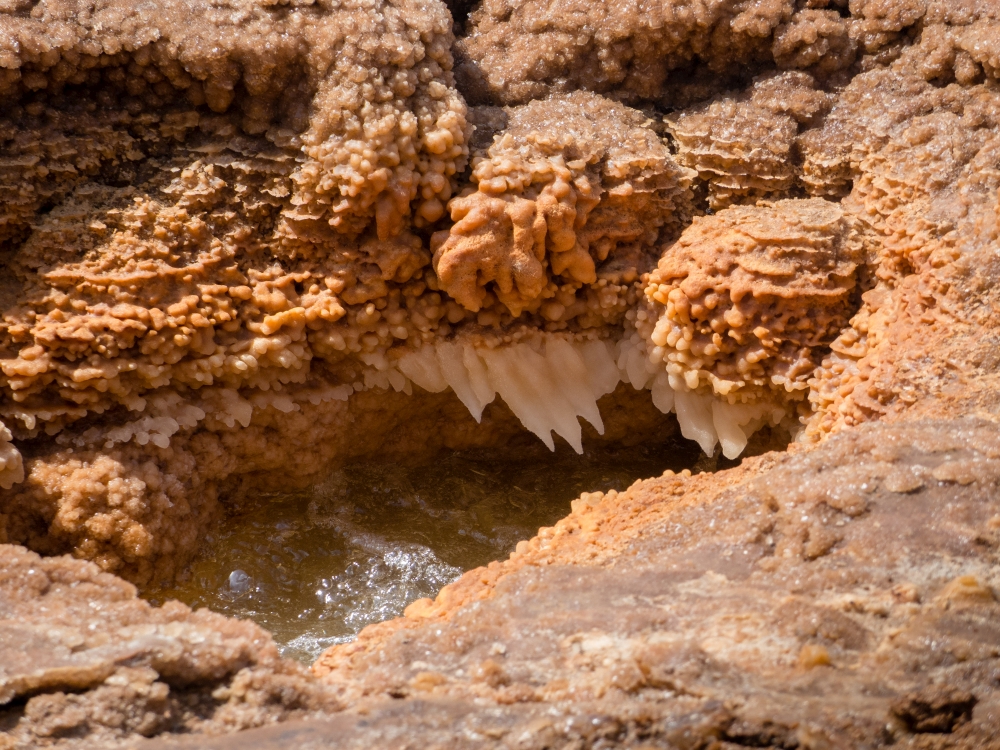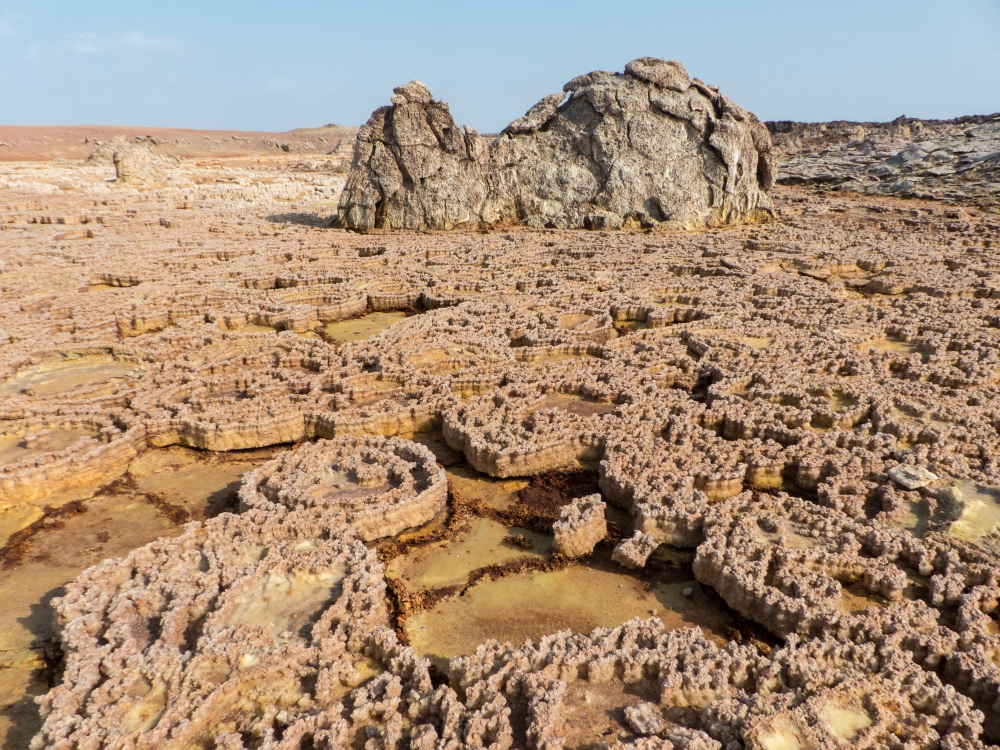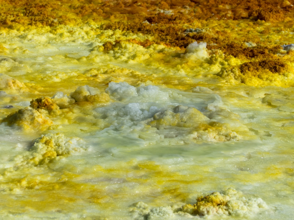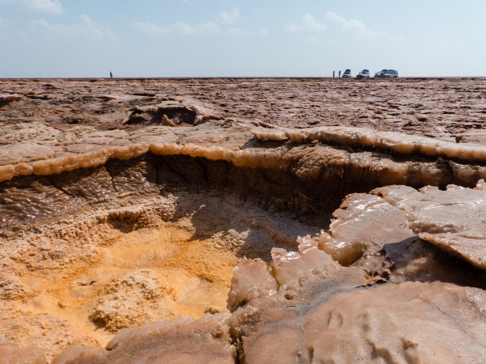 Unser Ziel sind heute die Schwefelterrassen des Dallol-Vulkans in einem der vulkanisch aktivsten Gebiete der Erde. Wir sind nicht die ersten, ein paar Jeeps haben schon vor der flachen Felserhebung geparkt. Dicht vermummt gegen die Temperaturen verlassen wir unsere gekühlten Fahrzeuge. Sogleich werden wir eingehüllt von der Hitzewolke. Nur knapp 40 Grad heute. Relative kühl, wie wir erfahren: in den Sommermonaten kann es bis zu 50 Grad heiß werden.