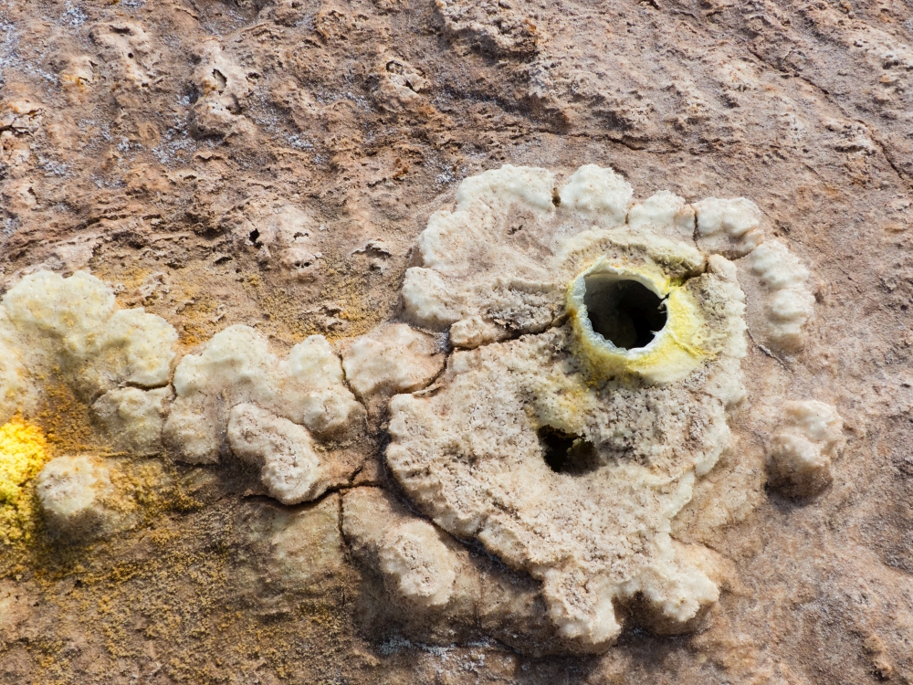 Langsam gehen wir über die dunklen Steine nach oben, auf die kleinen Rauchwölkchen zu. Bizarr geformte Felsentürmchen begleiten uns. Dann ist der Boden mit runden, schneckenform-artiken Muster bedeckt: kleine Häufchen aus Salzkristallen. Die Oberfläche scheint hier brüchig. Platten, die sich übereinanderstapeln. Wir folgen vorsichtig der Spur unseres Guides durch die unwirkliche Landschaft.