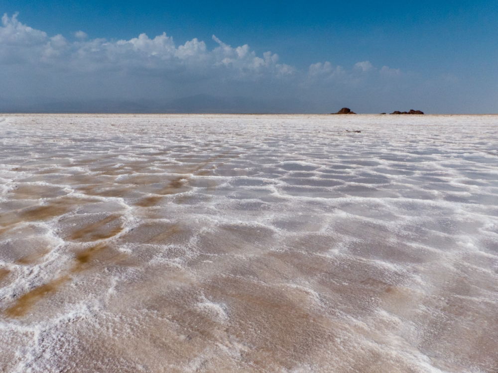Doch heute ist es soweit: die Räder unserer Fahrzeuge erzeugen kleine Wasserfontänen, wie sie über die endlos glatte Fläche der Salzwüste fahren. Rechts und links nur weiß. Ab und zu ragt ein dunkler Felsen wie eine Insel aus dem Wasser. Die Luft flimmert, die Klimaanlage läuft auf Hochtouren. Kaum vorstellbar, dass hier immer noch Salz abgebaut wird und sich an anderen Tagen lange Kamel-Karawanen über die Ebene bewegen.