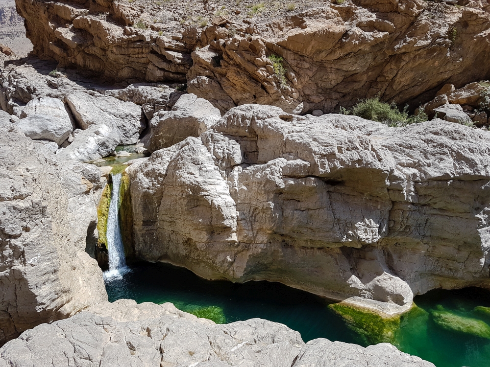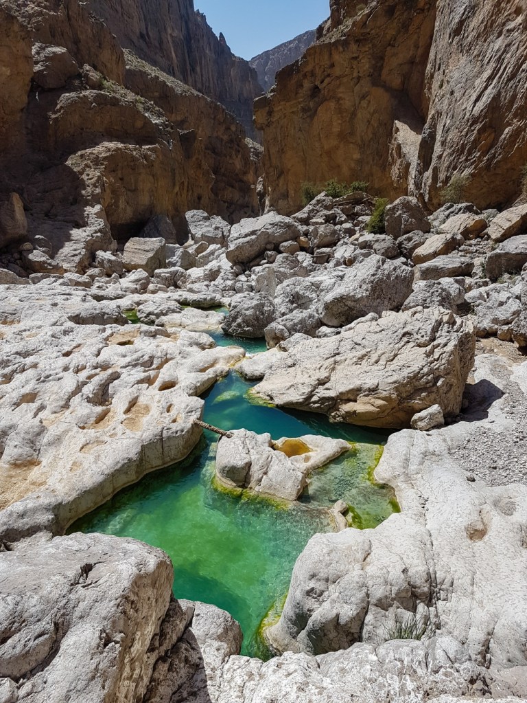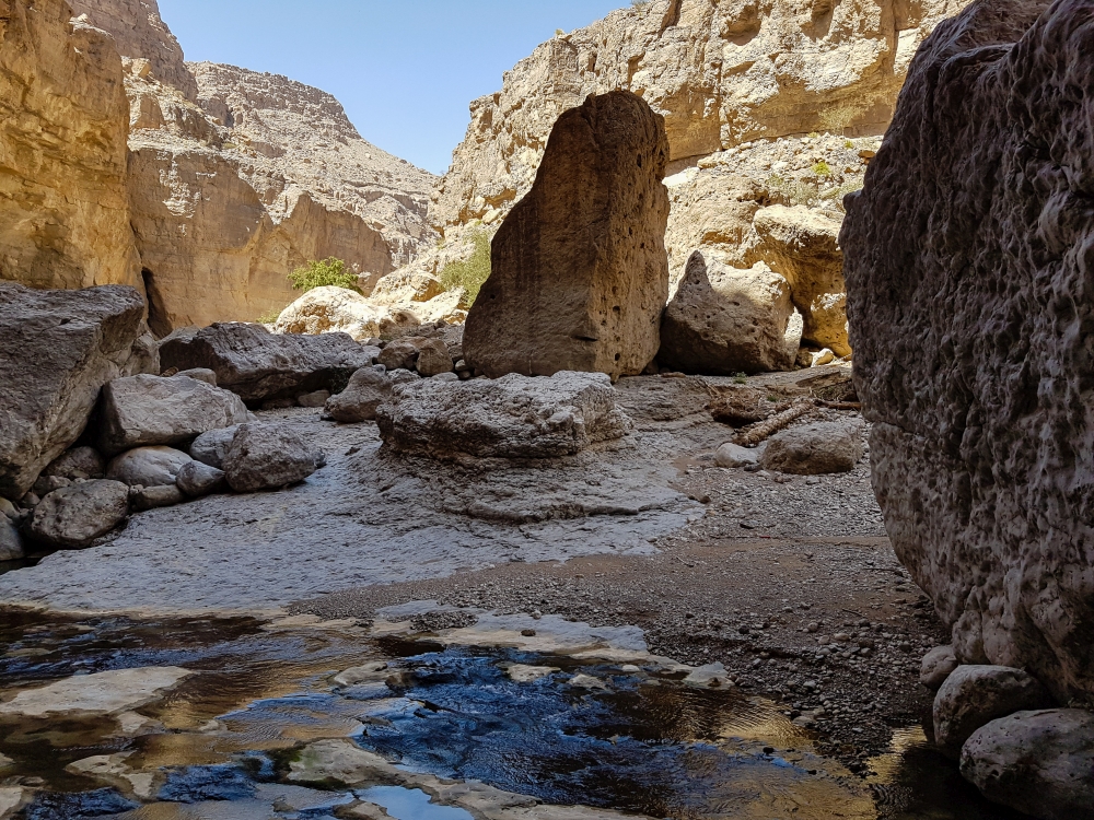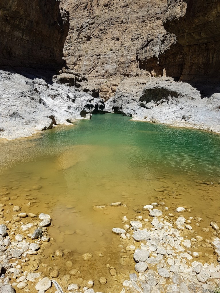 Das Wadi Bani Khalid gehört zu den bekanntesten Wadis im Oman und die türkisen Pools sind ein beliebte Touristenattraktion. Wir sind aber etwas weiter südlich unterwegs und somit heute auch die Einzigen in dieser beeindruckenden Felsenlandschaft.