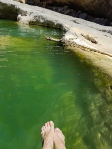 Dann kommt die erste Schwimmpassage: wir stehen an einem tiefgrünen Pool, der vor uns inmitten riesiger Felswände verschwindet. Also alles, was nicht nass werden soll, im wasserdichten Packsack verstauen (und hoffen, dass er auch wirklich dicht ist). Einer nach dem anderen lassen wir uns in das Wasser gleiten, das im Vergleich zur heißen Luft angenehm kühl ist. Ich spüre keinen Grund unter mir und fühle mich etwas komisch, wie ich den anderen folge. Jeder zieht als Boje seinen bunten Beutel hinter sich her, der sich tapfer auf der Wasseroberfläche hält. Links und rechts ragen die Felsen steil nach oben, vor und hinter mir ist Wasser. Meine Arme schimmern leicht grünlich im glasklaren Nass, die Sandalen an meinen Füßen scheinen über einer unendlichen Tiefe zu schweben. Ich spüre keine Strömung. Man hört nur die kleinen Wellen der Schwimmzüge. Und unsere Stimmen hallen von den Wänden wider wie in einer riesigen Kirche.