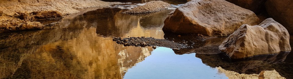 Nach einer kurzen Rast erreichen wir die Palmen der nächsten Oase und lassen die wilde Schlucht hinter uns. Knappe 10 Kilometer sind wir das Flussbett entlang gewandert, geklettert und geschwommen. Haben eine Ahnung von der Macht der Naturgewalten bekommen und wie klein man sich daneben fühlt.