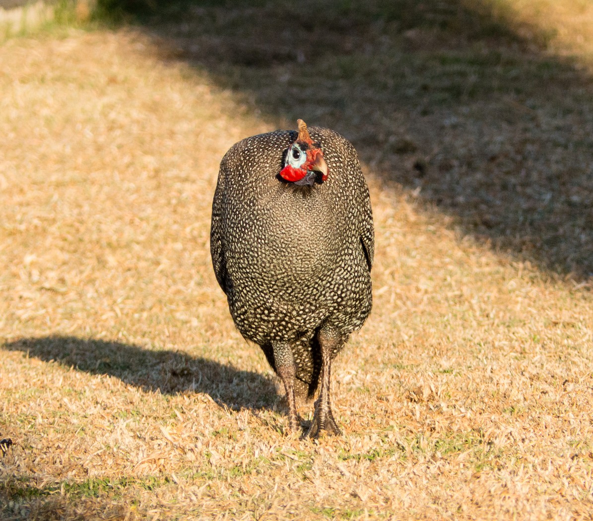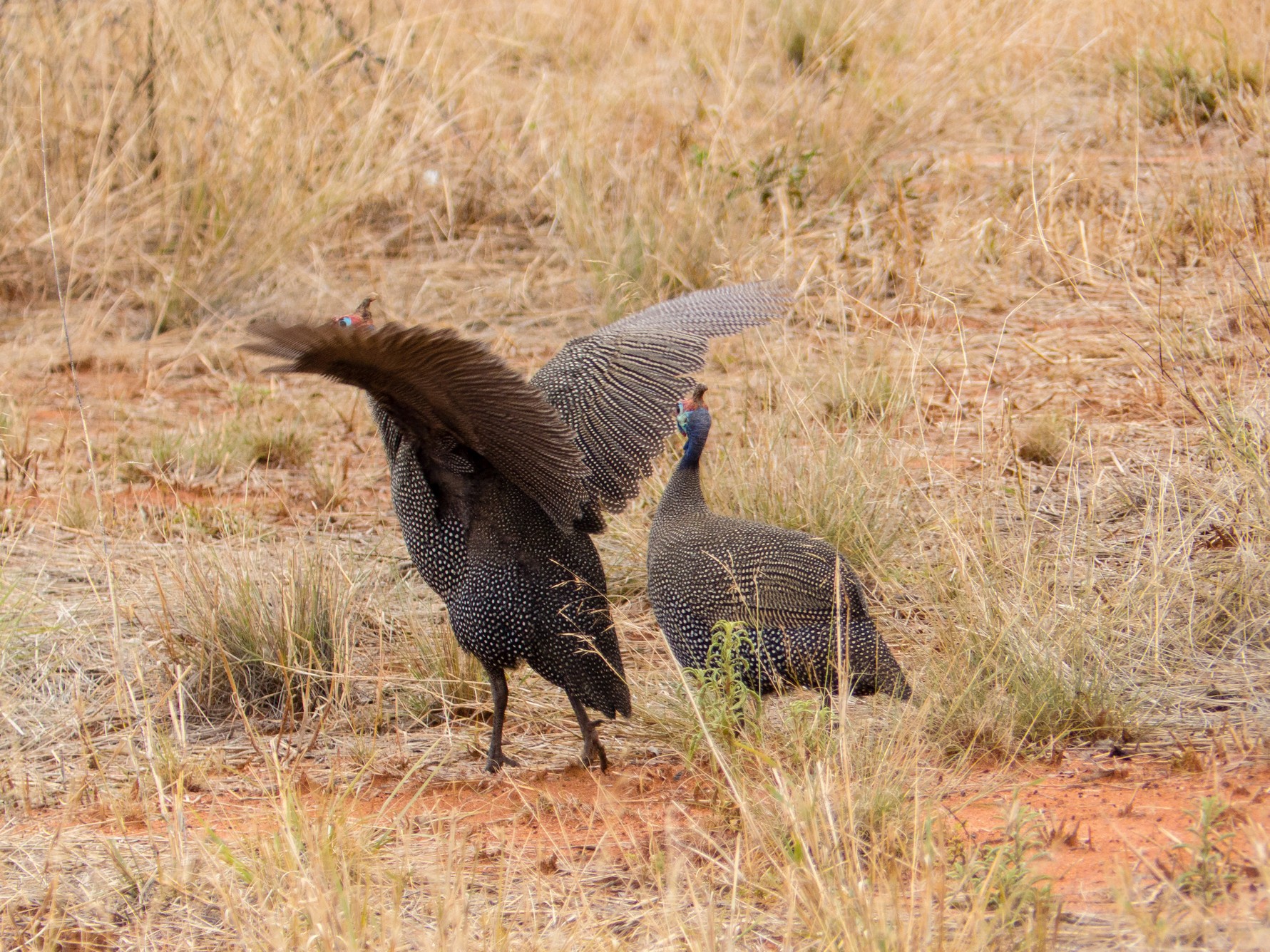Zurück bleiben zwei frustrierte Großkatzen und eine Gruppe siegreicher Perlhühner, die schon wieder unschuldig im Gras scharren, als wäre nichts gewesen.
