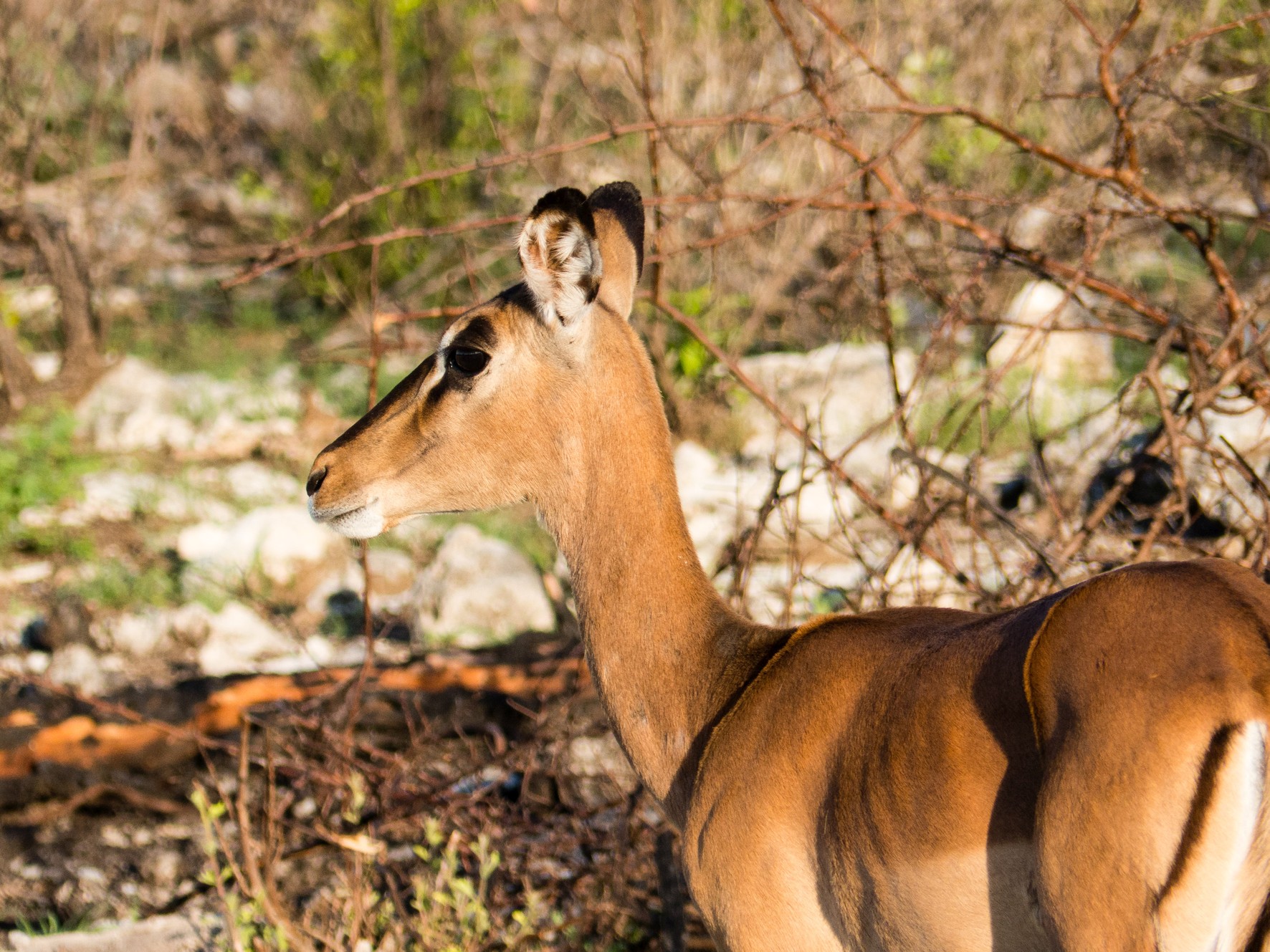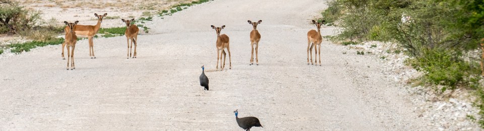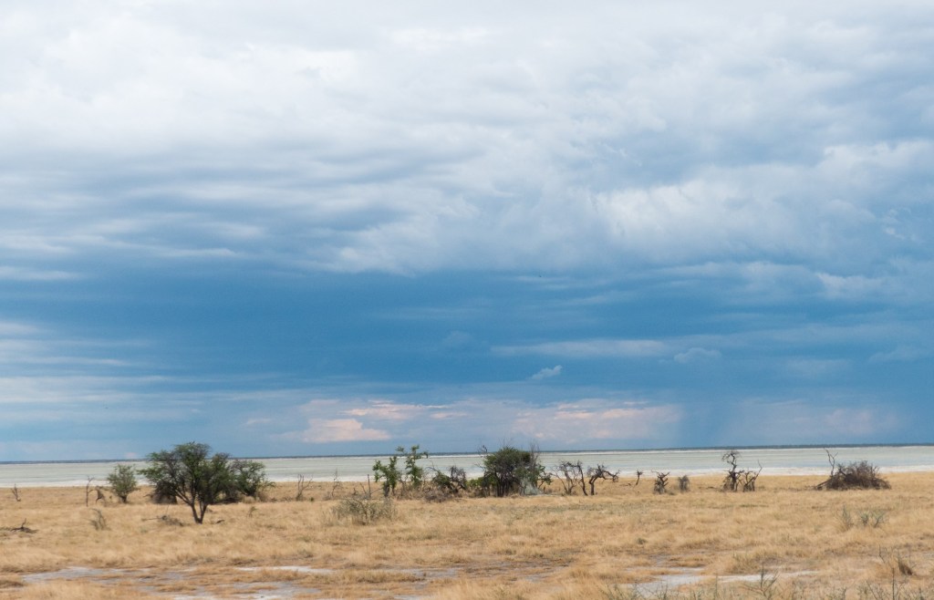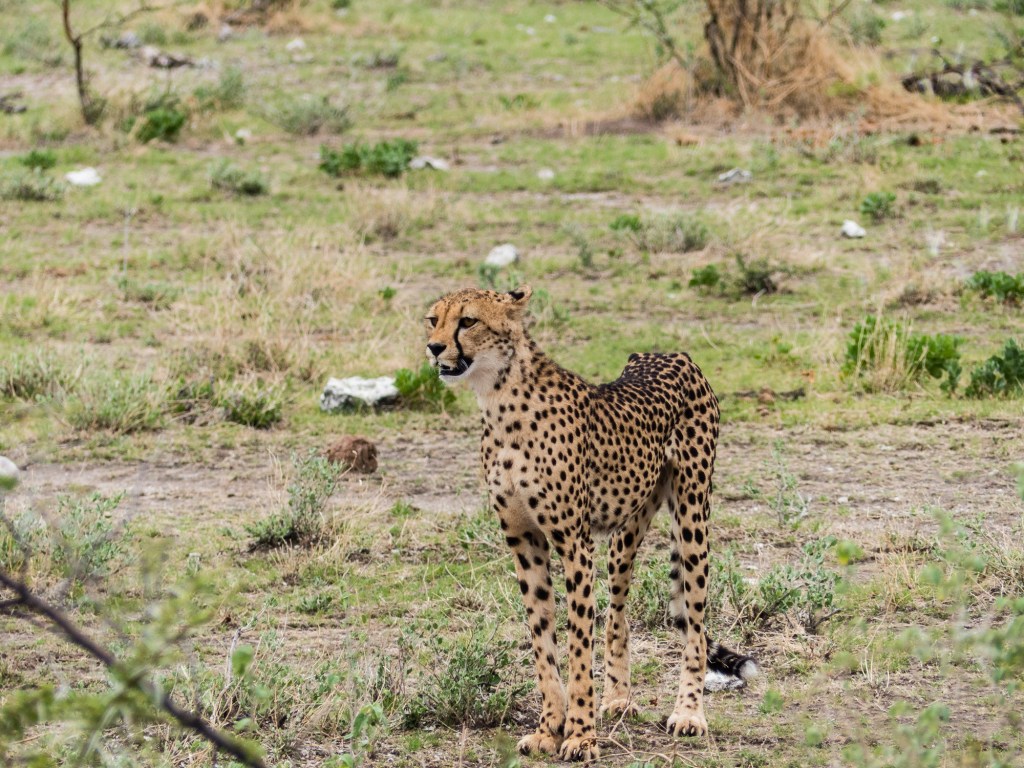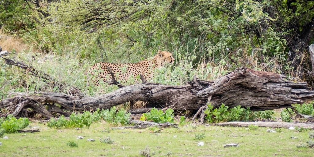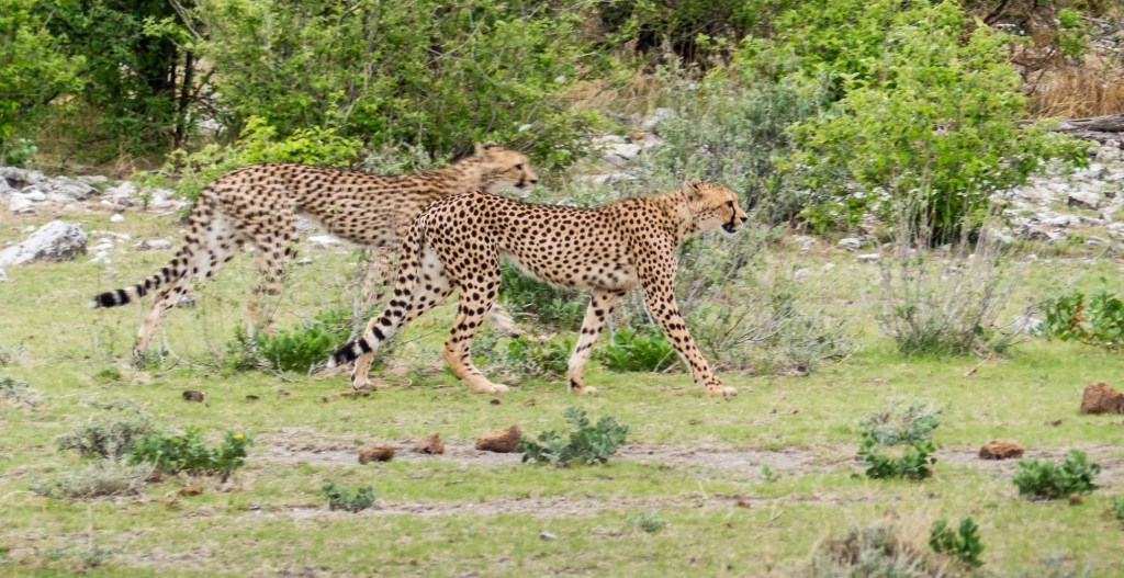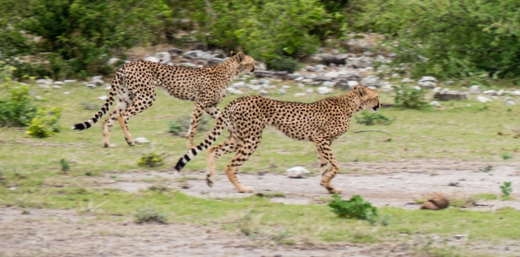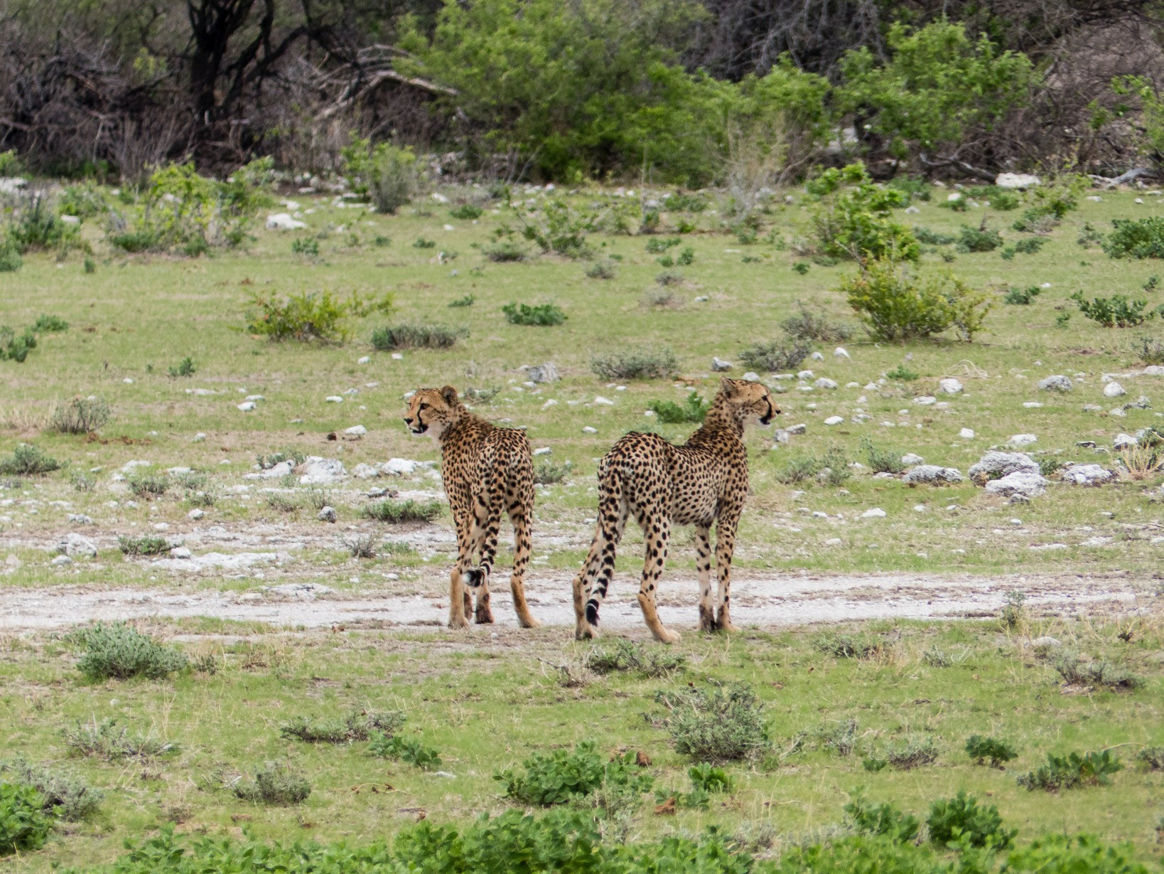 Es ist unser zweiter Tag im Etosha Nationalpark, es wird schon dämmerig und dicke Regenwolken hängen am Horizont. Eigentlich sind wir auf dem Rückweg zu unserer Lodge, als unser Guide noch mal durchs Fernglas schaut und dann aufgeregt auf die Piste deutet, die in der Ferne parallel zu uns verläuft: dort dürften gerade zwei Geparden vor einem Auto die Seite wechseln. „Let’s get there!“, und schon sitzt er wieder hinter dem Lenkrad und steuert auf den Punkt in der Ferne zu.