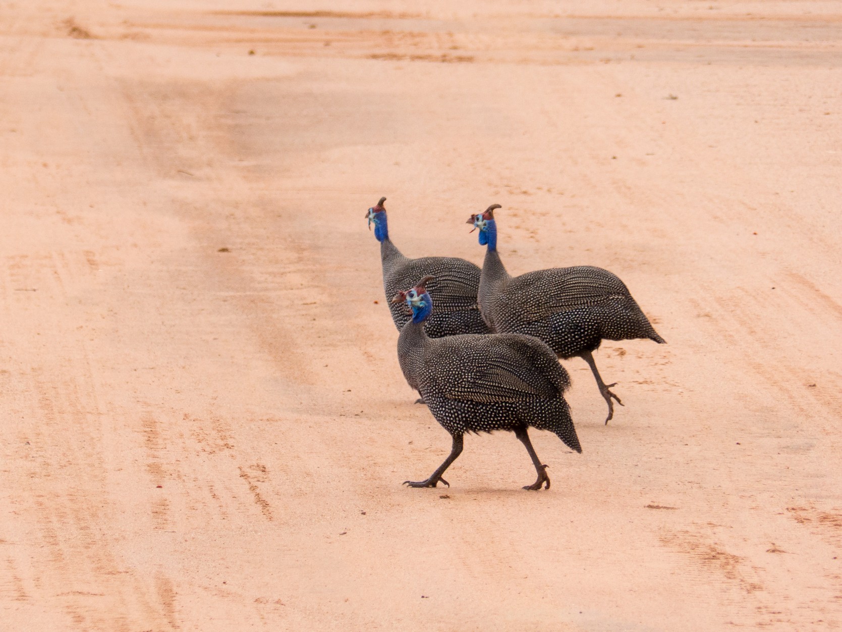 Gespannt suchen wir die Savanne ab, die hier auch immer wieder von dornigen, mit kleinen Blättern geschmückten Büschen bevölkert wird. Das Muster der großen, schlanken Katzen ist aber auch wirklich eine zu gute Tarnung! Aber dann kommen sie beide aus der grünen Deckung. Schauen kurz in unsere Richtung und konzentrieren sich dann auf eine Gruppe Impalas, die ahnungslos in gut hundert Metern Entfernung grast. In Gesellschaft von einigen Helmperlhühnern: so genannt, wegen ihrem hornartigen Gebilde auf dem Kopf. Auch sie scharren unbeirrt im staubigen Boden. „Government Chicken“ nennt sie unser Guide: „They are everywhere and well protected.“