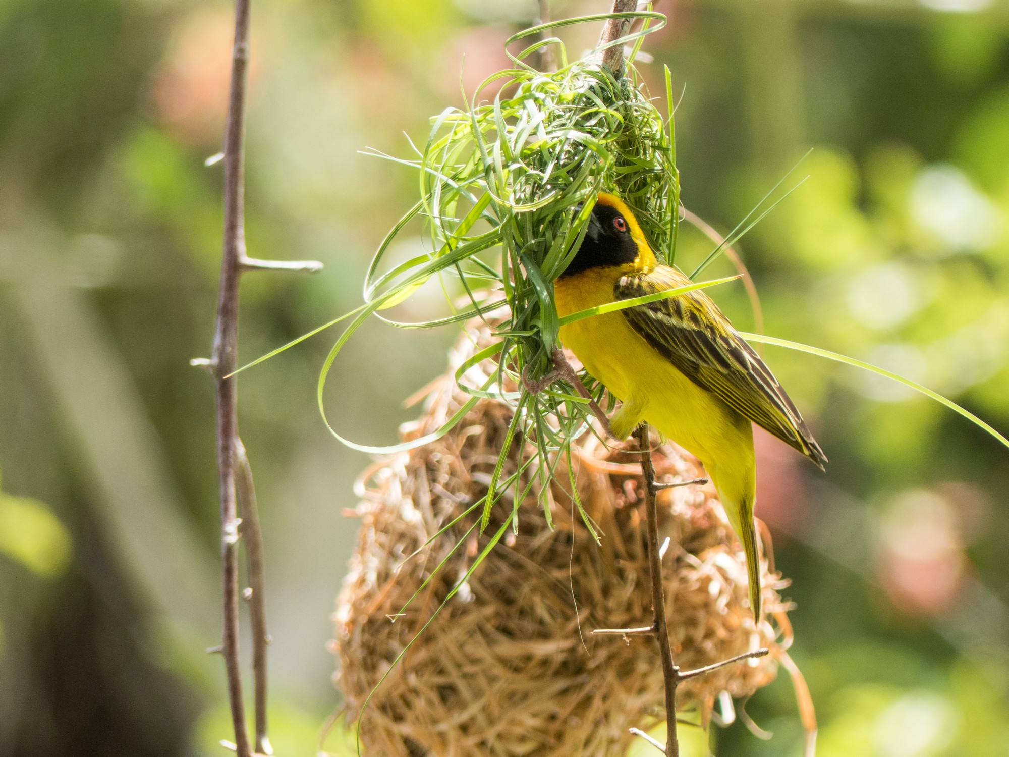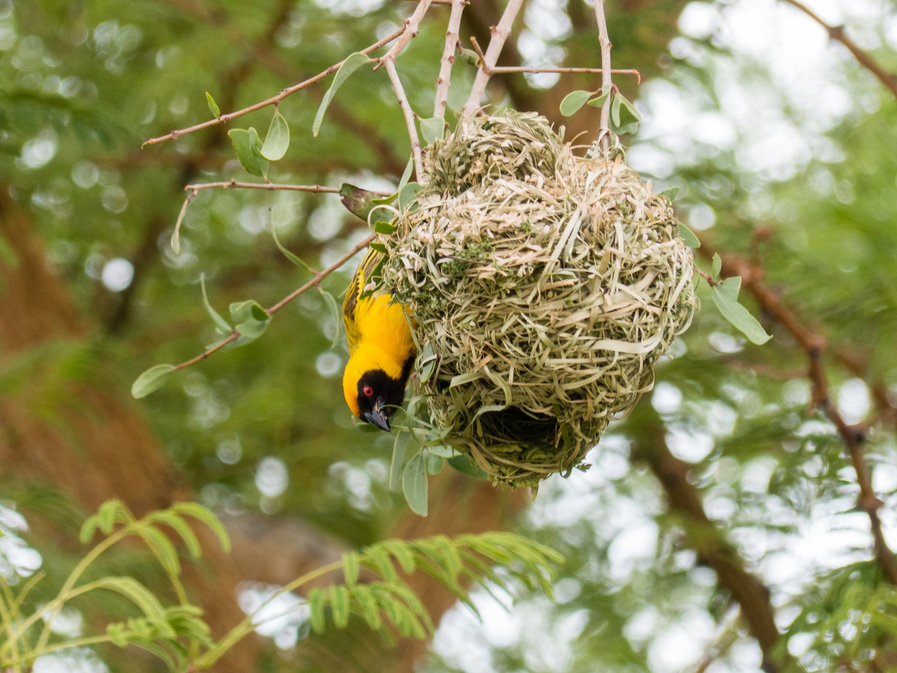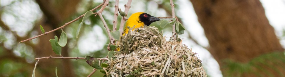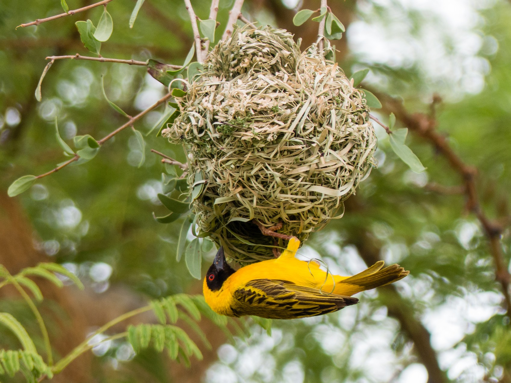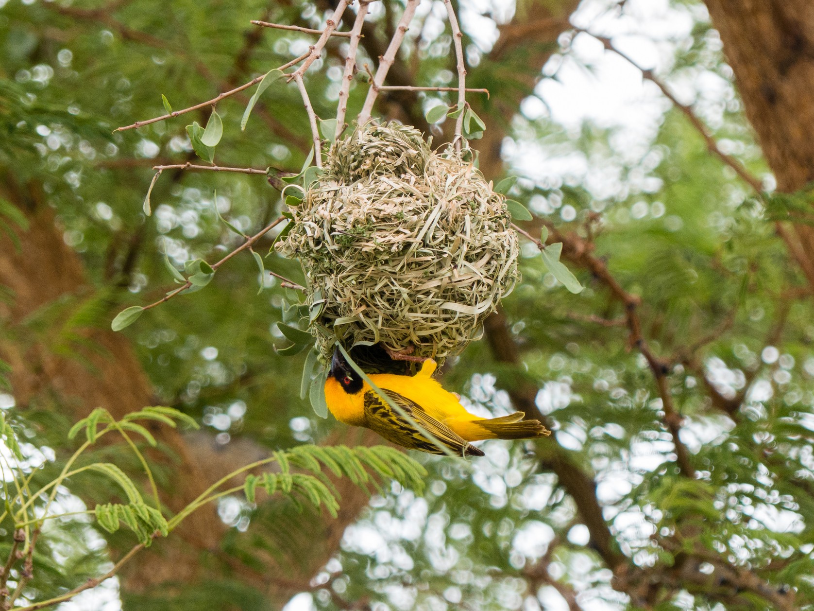 Schon am zweiten Tag sind sie mir aufgefallen: ihr lautes Zwitschern, das aus dem Baum kam, das Flattern von kleinen Flügeln zwischen den Blättern. Gelbe Federbällchen mit schwarzem Kopf, in dem wache, rote Augen sitzen: Maskenweber. Aufgeregt hüpfen sie auf den Zweigen auf und ab, breiten ihre Flügel aus, machen sich groß: „Hier bin ich! Hier bin ich! Schau, was ich Schönes für dich gebaut habe!“