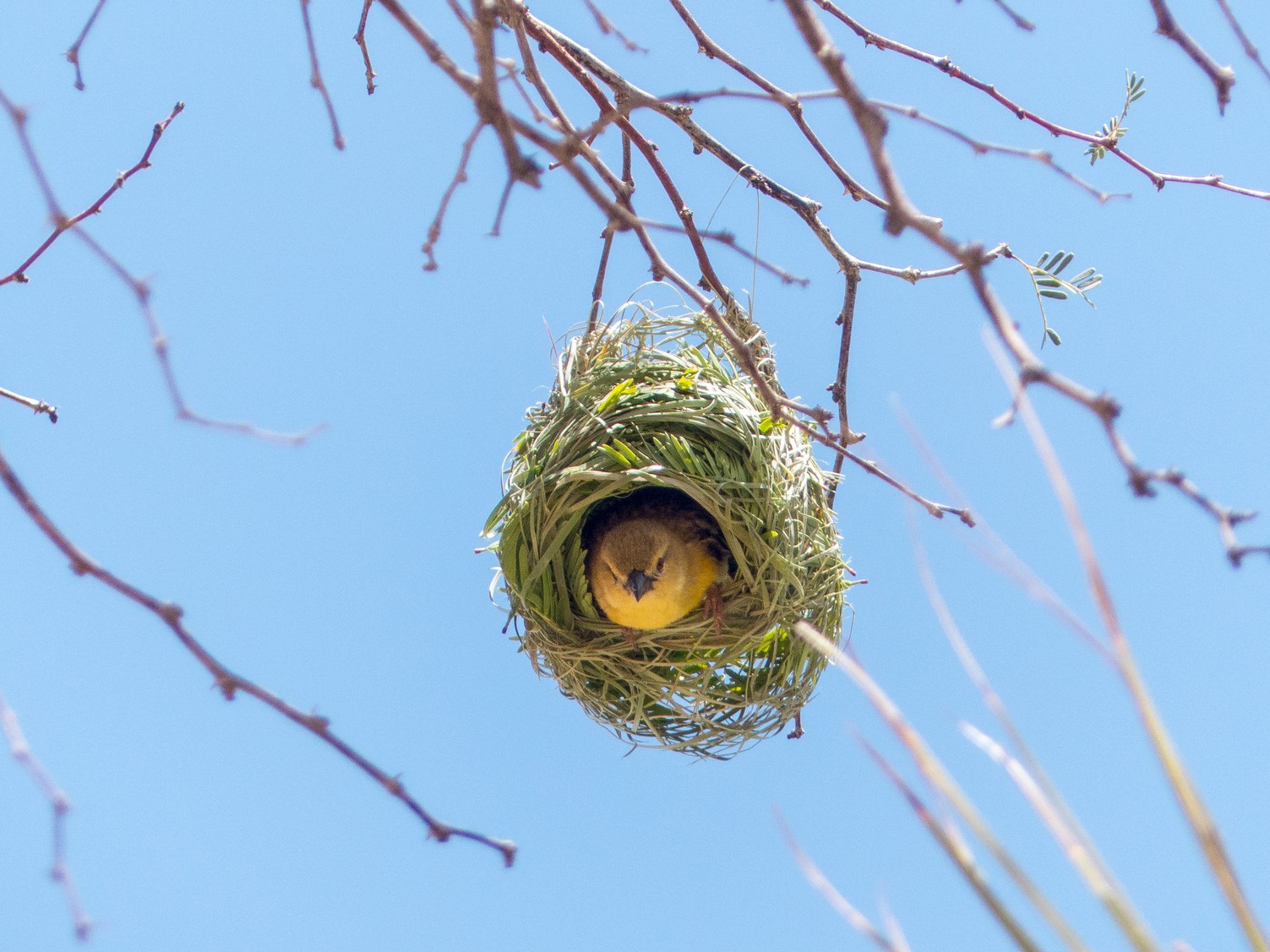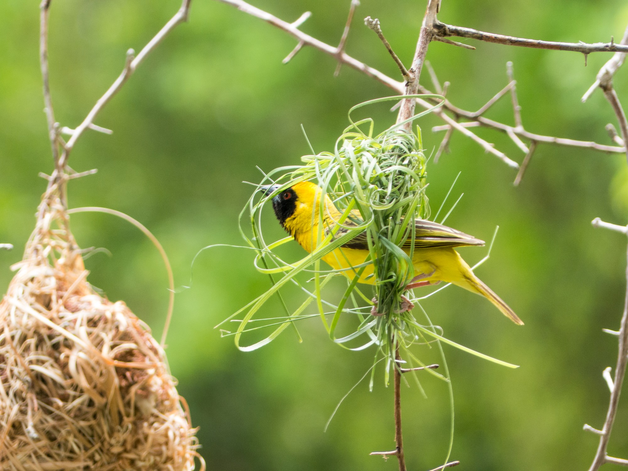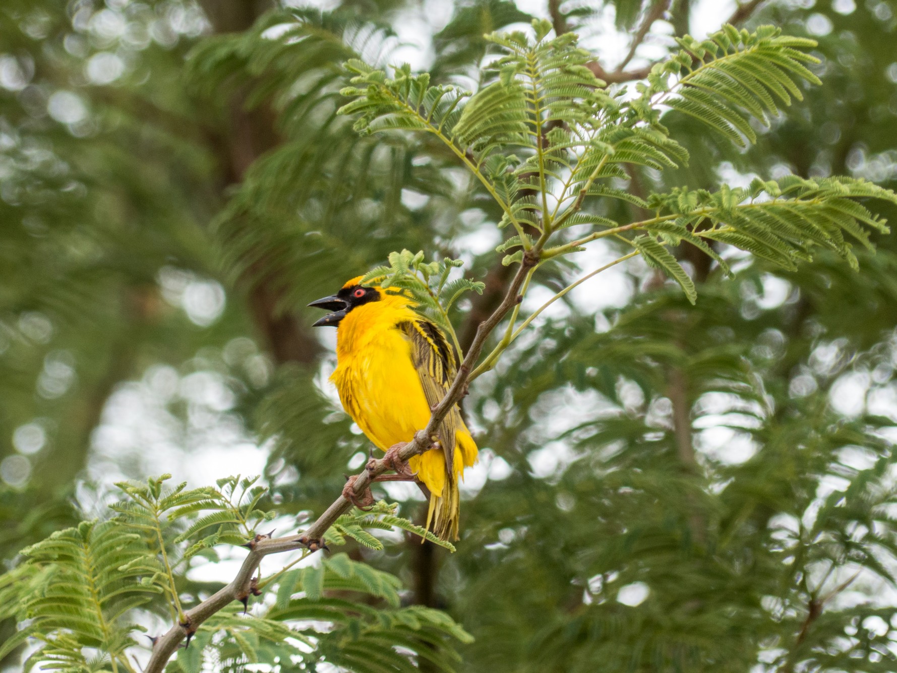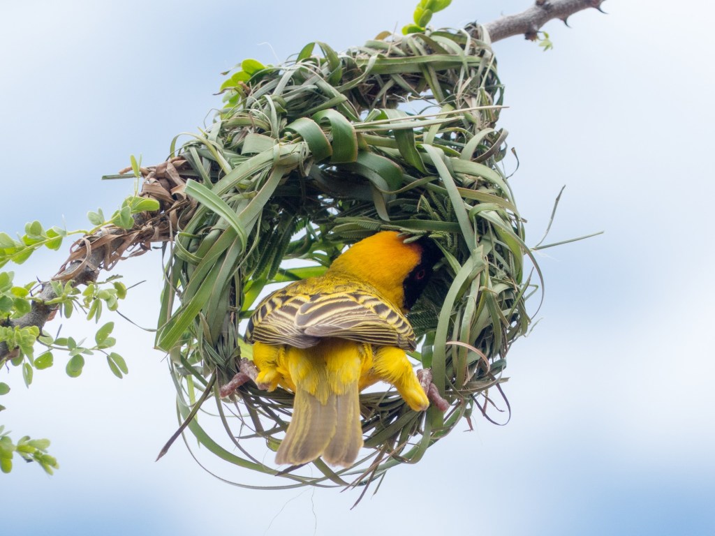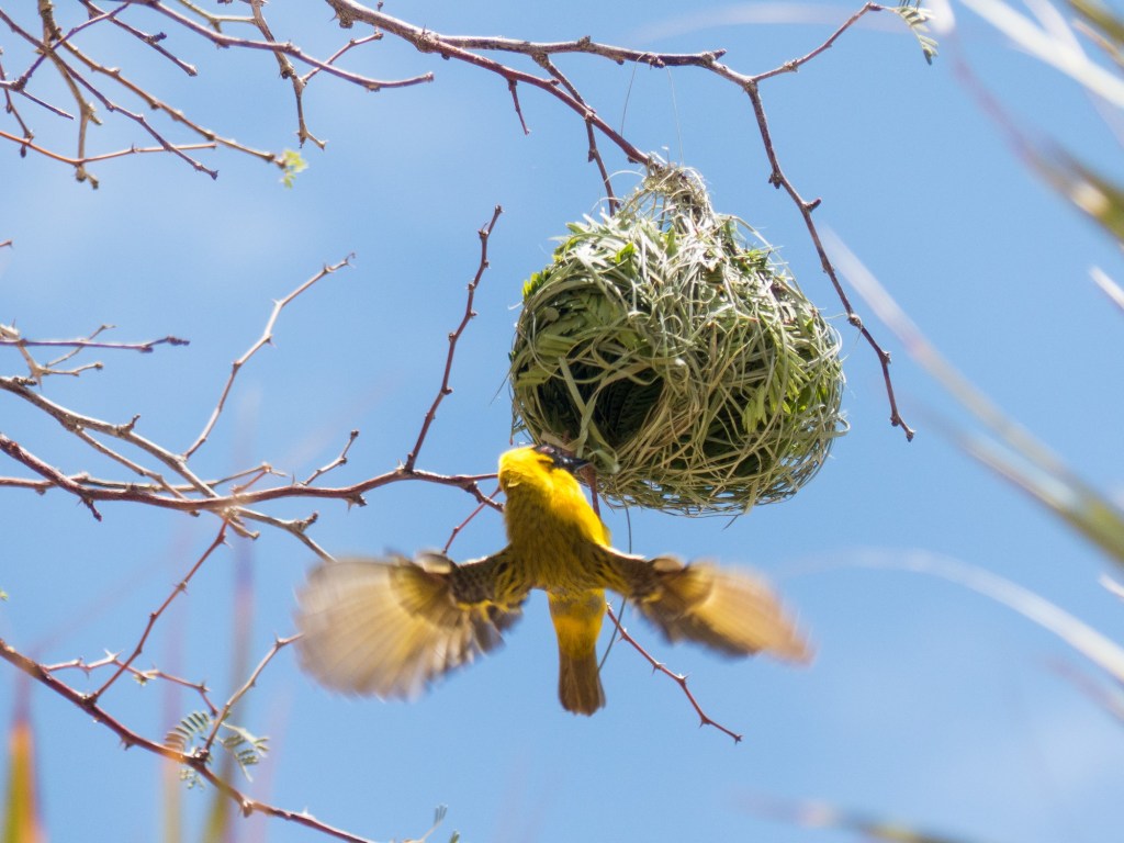 Schon am zweiten Tag sind sie mir aufgefallen: ihr lautes Zwitschern, das aus dem Baum kam, das Flattern von kleinen Flügeln zwischen den Blättern. Gelbe Federbällchen mit schwarzem Kopf, in dem wache, rote Augen sitzen: Maskenweber. Aufgeregt hüpfen sie auf den Zweigen auf und ab, breiten ihre Flügel aus, machen sich groß: „Hier bin ich! Hier bin ich! Schau, was ich Schönes für dich gebaut habe!“