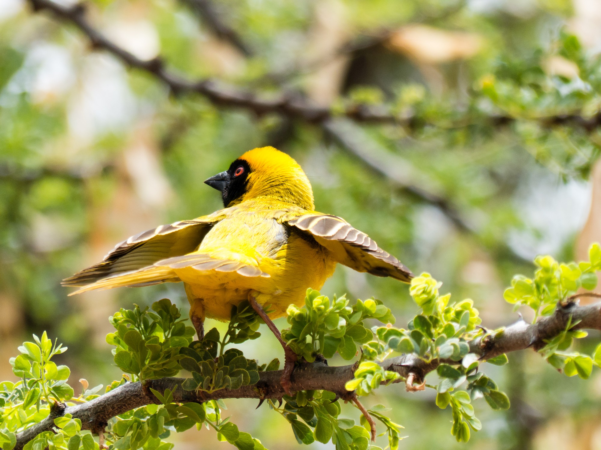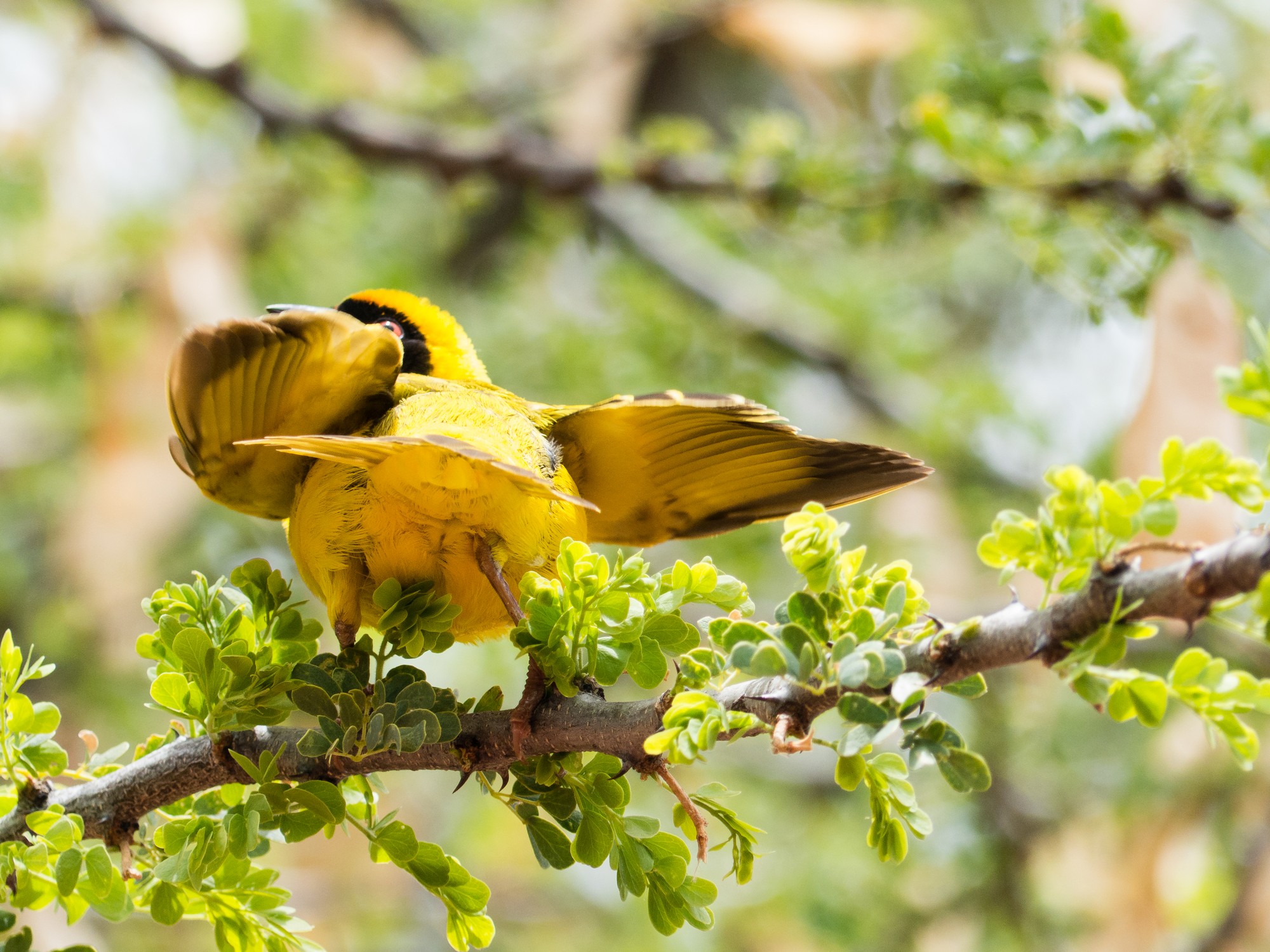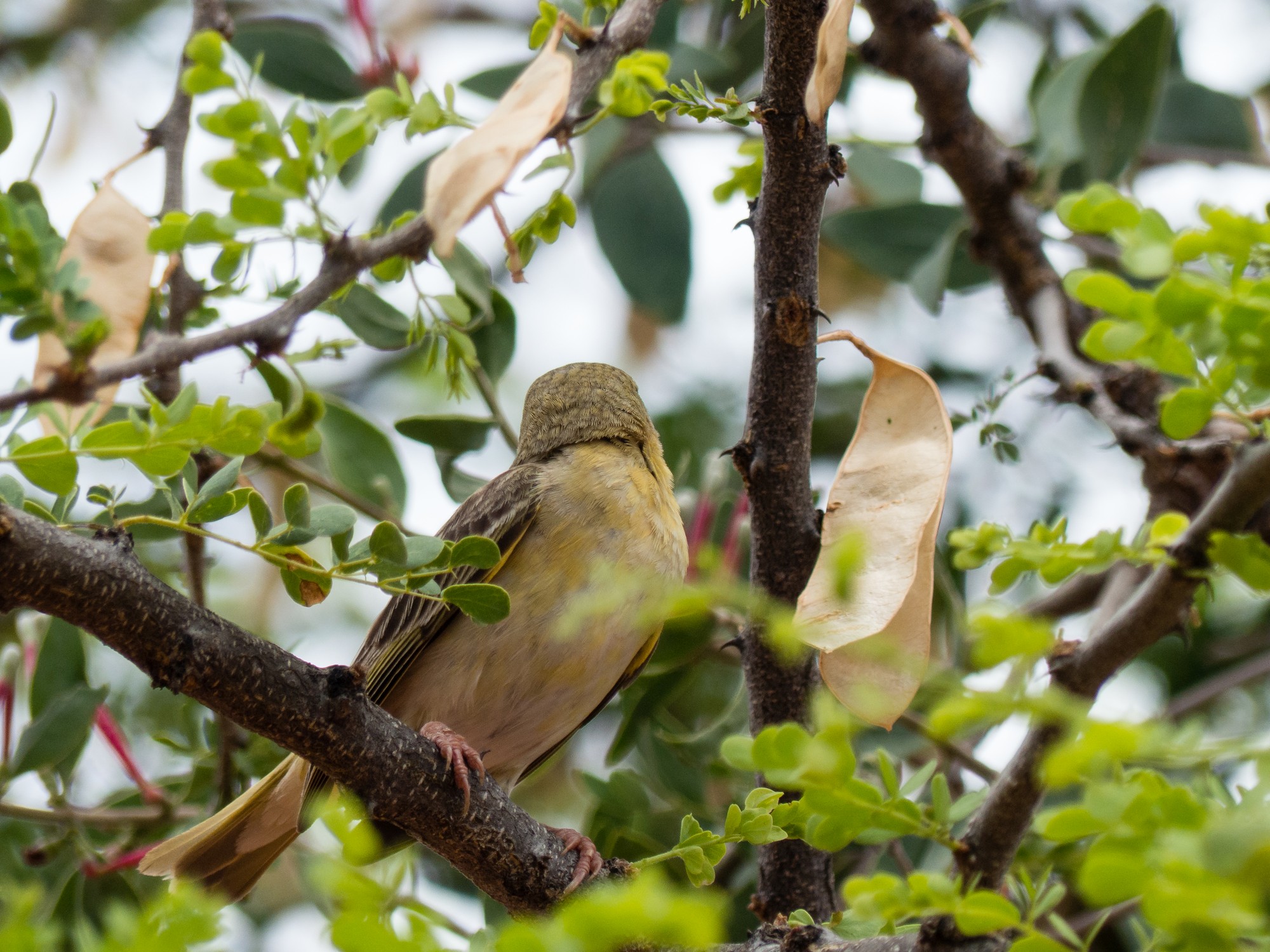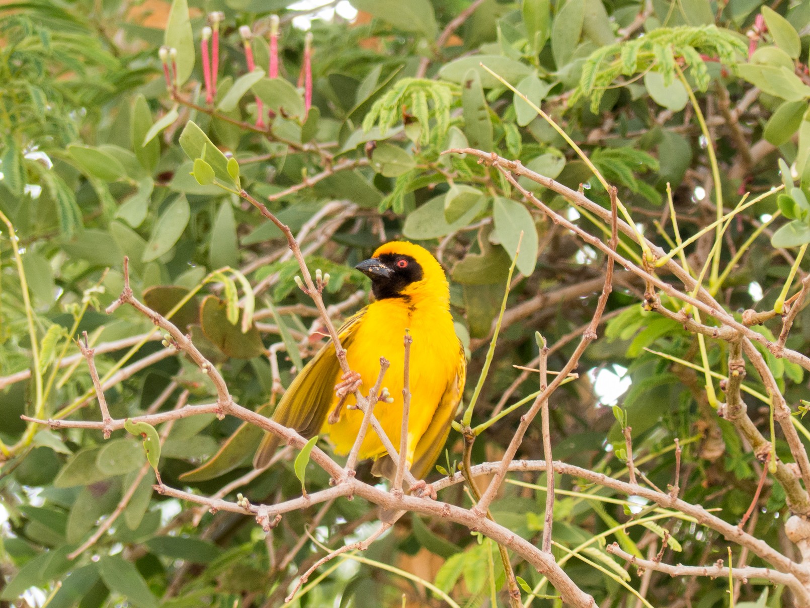 Schon am zweiten Tag sind sie mir aufgefallen: ihr lautes Zwitschern, das aus dem Baum kam, das Flattern von kleinen Flügeln zwischen den Blättern. Gelbe Federbällchen mit schwarzem Kopf, in dem wache, rote Augen sitzen: Maskenweber. Aufgeregt hüpfen sie auf den Zweigen auf und ab, breiten ihre Flügel aus, machen sich groß: „Hier bin ich! Hier bin ich! Schau, was ich Schönes für dich gebaut habe!“