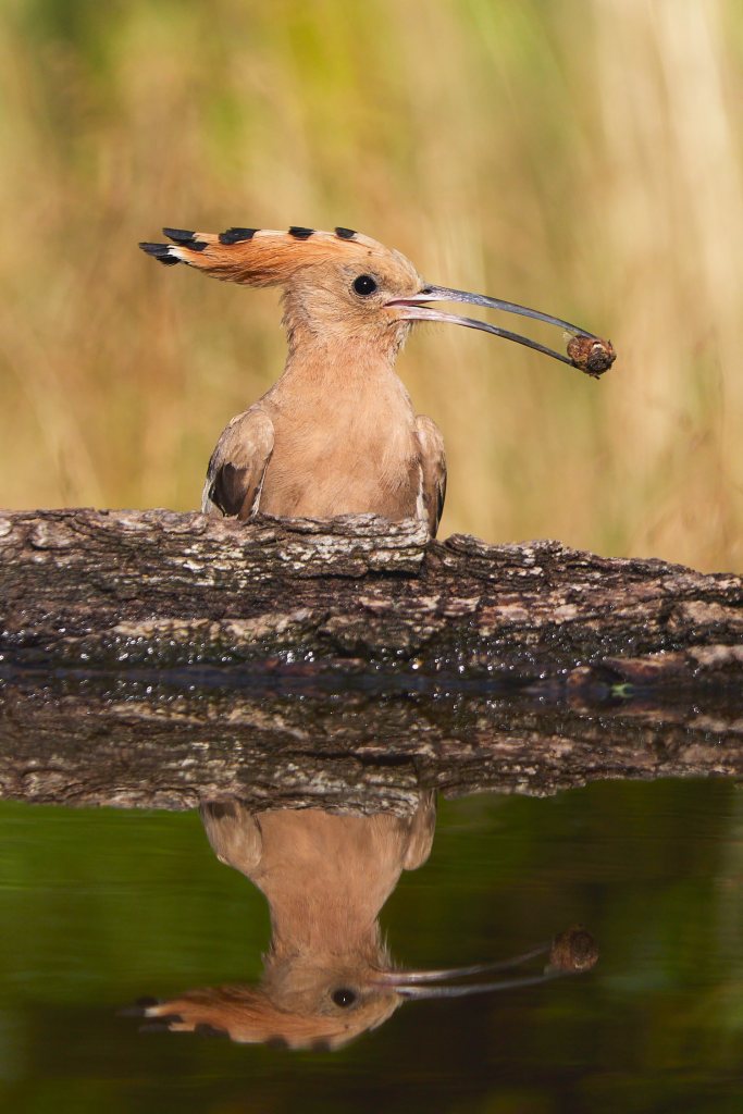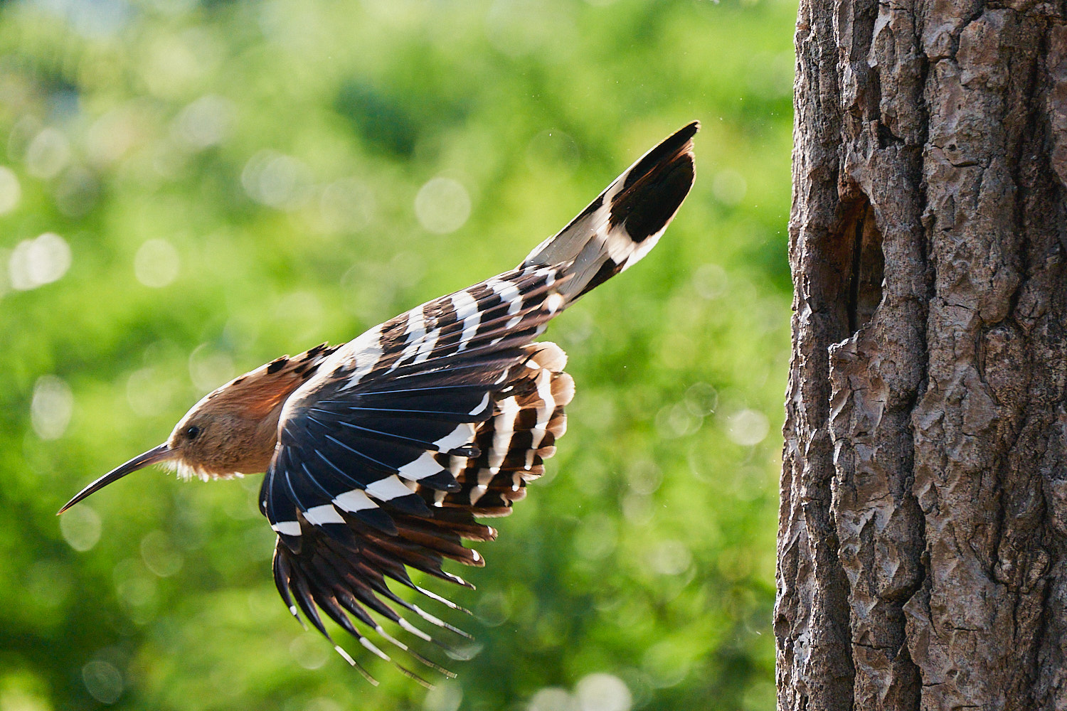 Plötzlich huscht etwas Schwarz-Weißes von links ins Bild. Gleichzeitig ertönt neben mir ein Geräusch wie von einem Maschinengewehr. Aber es fliegen keine Federn durch die Luft, obwohl ich mir sicher bin, dass Roman neben mir sein Ziel getroffen hat. Der Wiedehopf verschwindet unbeschädigt im Astloch vor uns. Roman schaut mich über das Objektiv seiner Kamera an und hebt den Daumen. Nun sollte ich vielleicht auch mal meine Kamera in die richtige Position bringen, um den Abflug aus der Höhle nicht zu verpassen. Checken, ob die Einstellungen stimmen, auf das Loch im Baumstamm scharf stellen und mit dem Finger am Auslöser warten. Als der lange gebogene Schnabel zu sehen ist, bin ich schon kurz davor, abzudrücken. Aber er verschwindet gleich wieder. Unsere Geduld wird auf die Probe gestellt: Großreinemachen ist angesagt. Immer wieder werden kleine Grasbüschel aus dem Loch nach draußen befördert. Schließlich kommt dann doch der Kopf wieder zum Vorschein und Mama Wiedehopf startet unter erneutem Kamera-Gewitter zum nächsten Versorgungsflug.