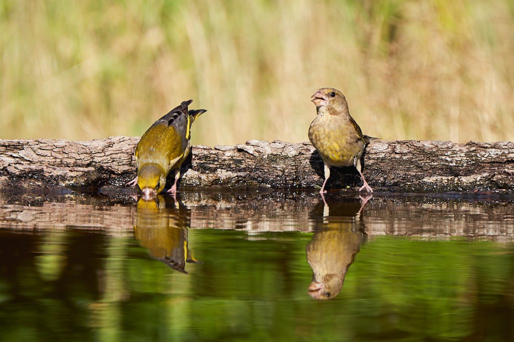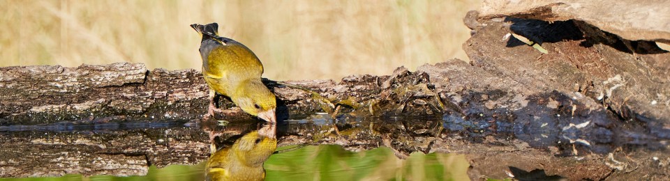 Zwei Grünfinken landen am Pool-Ufer und genehmigen sich ein paar Schluck Wasser. Auch ein Neuntöter wagt sich heran und setzt sich auf einem nahen Ast wunderschön in Pose.