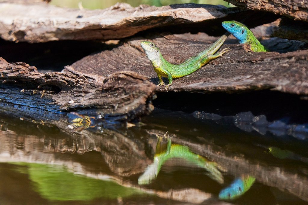 Es wird wieder ruhig. Ein Spatz flattert vorbei, trinkt vom Pool und schaut dann neugierig in die Bruthöhle. Scheint nicht sehr spannend zu sein. Von rechts erscheint ein Smaragdeidechsen Pärchen. Ihr leuchtendes Blau und Grün spiegelt sich im Wasser.