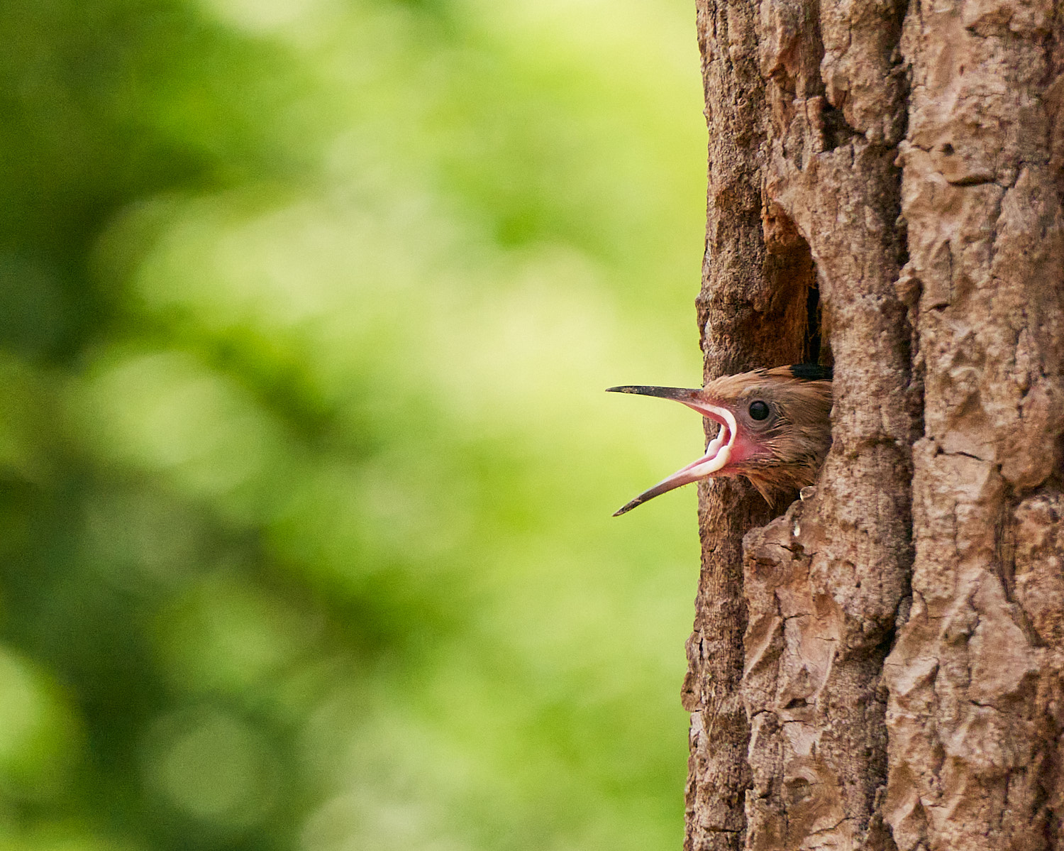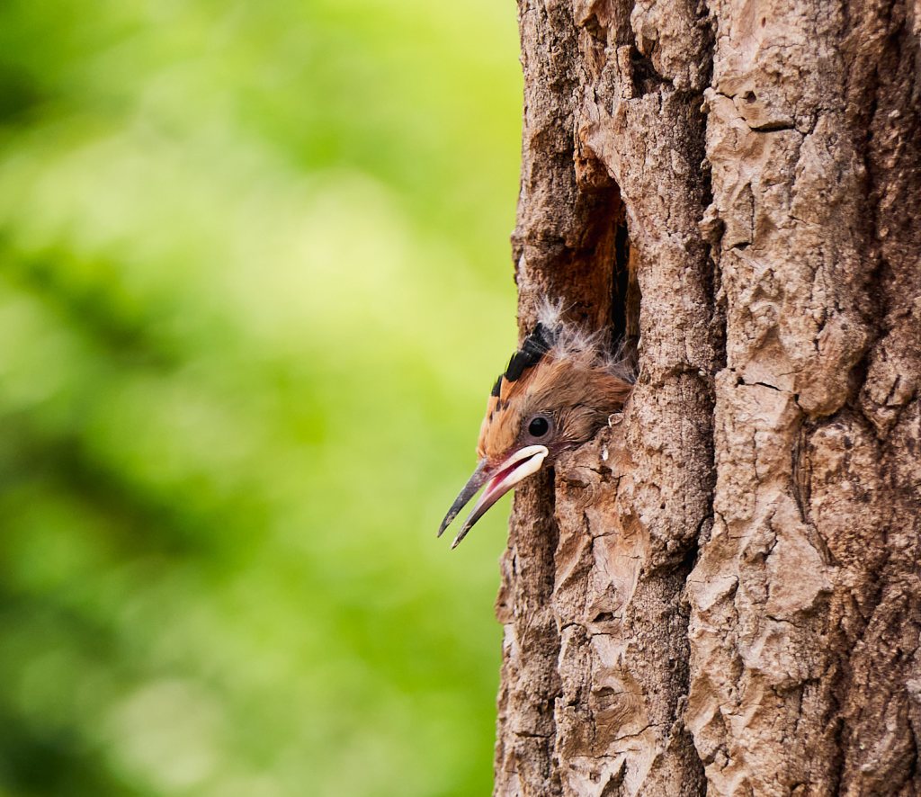 Dann tut sich was in der Wiedehopf-Wohnung: ein kleiner, weiß eingerahmter Schnabel erscheint und gleich darauf der Kopf mit einer orangen Andeutung der Federhaube. Offensichtlich kann es der Spross gar nicht mehr erwarten, bis es Nachschub gibt. Wie ein kleiner Clown sieht er aus, wie er sehnsüchtig in die Ferne blickt.