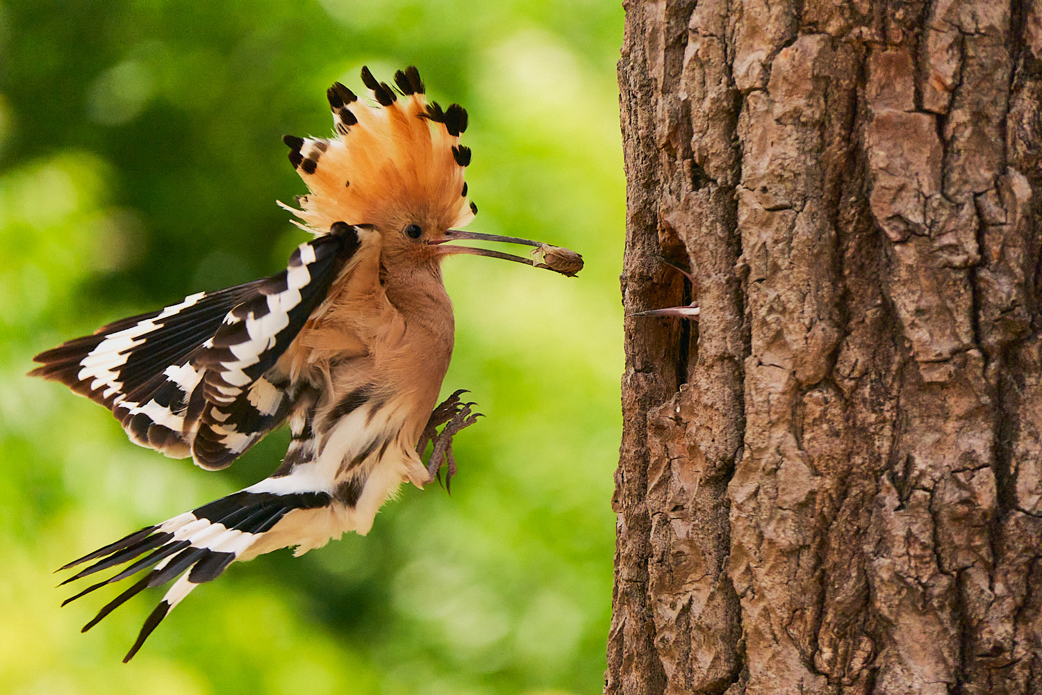 Roman gibt mir ein Zeichen: links im Baum sitzt schon ein Elternvogel, bereit für den nächsten Anflug. Kamera bereit machen, die Spannung steigt. Mit aufgestellter Federhaube kommt er auf den Nachwuchs zu, der schon erwartungsvoll den kleinen Schnabel aufsperrt. Wunderschön sind die schwarz-weiß gestreiften Flügel zu sehen, als er vor dem Baumloch abbremst. Und schon verschwindet das nächste große Insekt im Kinderschnabel. Gleich darauf ist der prachtvolle Vogel auch wieder zwischen den Bäumen verschwunden.