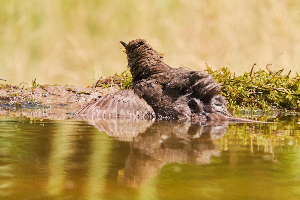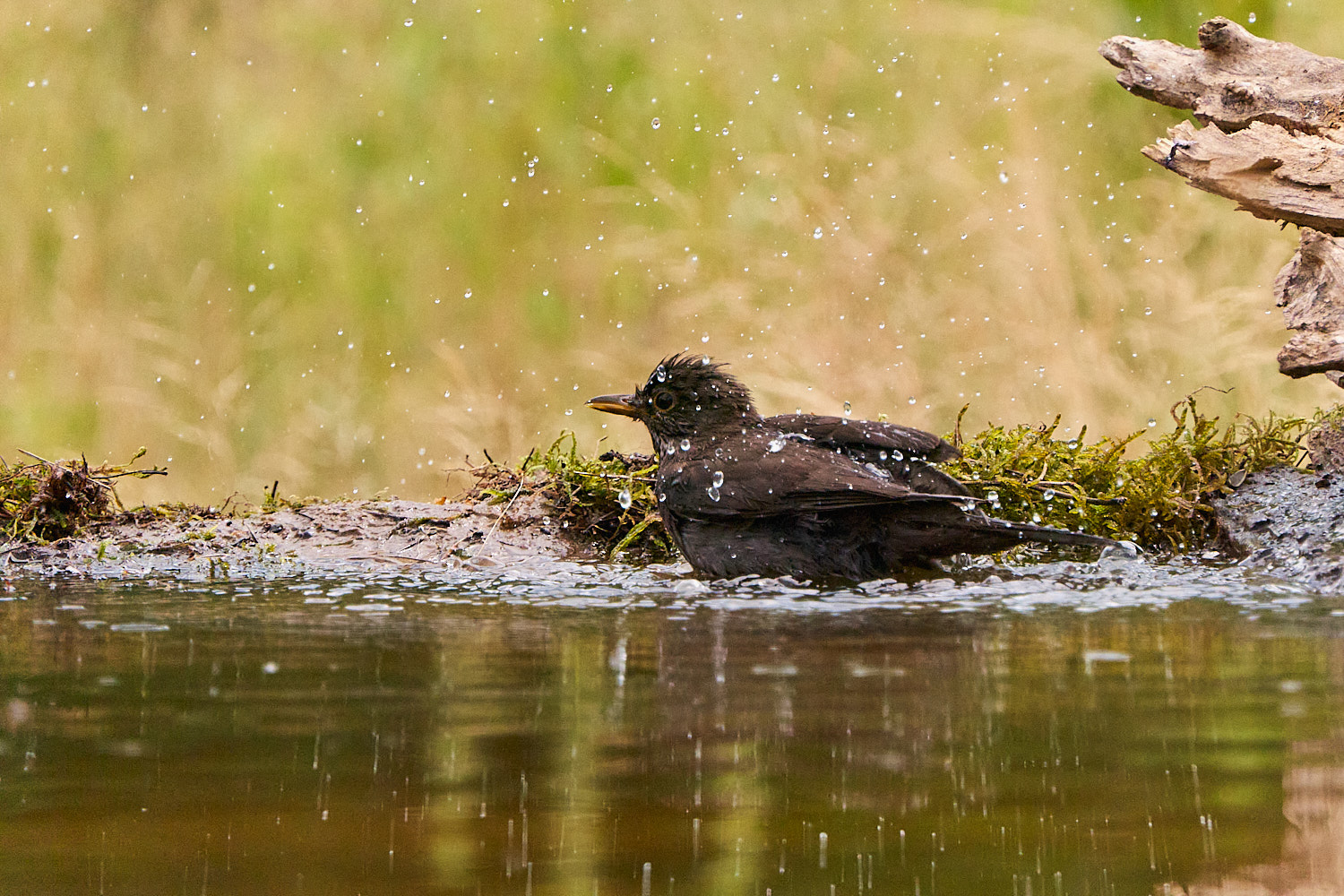 Am Ende des kleinen Pools vor uns landet eine Amsel, streckt vorsichtig den Fuß ins Wasser, bevor sie mit ausgebreiteten Flügeln fast komplett untertaucht. Kurz verharrt sie mit leicht geöffnetem Schnabel, dann startet der Badespaß: immer wieder verschwindet zuerst der Kopf im Wasser, dann schlägt sie kurz mit den Flügeln, dass die Wassertropfen nur so spritzen. Fliegt kurz auf den Ast daneben, schüttelt sich, kurzer Blick in die Runde, bevor sie sich erneut ins Bad stürzt und mit sichtlichem Vergnügen herum plantscht. Ich beneide sie schon ein bisschen um ihre Abkühlung, während es in der kleinen Hütte wohl schon an die 40 Grad hat.