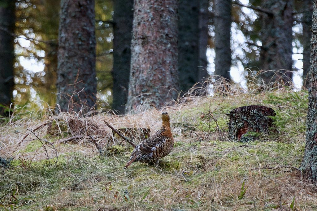 Ein weiterer Hahn und eine Henne tauchen auf. Kurz wird es unruhig, bis wieder klar ist, wer hier der „Platzhirsch“ ist, und der zweite auch schon wieder verschwunden ist. Doch auch die Henne scheint wenig interessiert, dreht sich noch kurz nach dem stolzen Herrn um und verschwindet dann wieder im Unterholz.