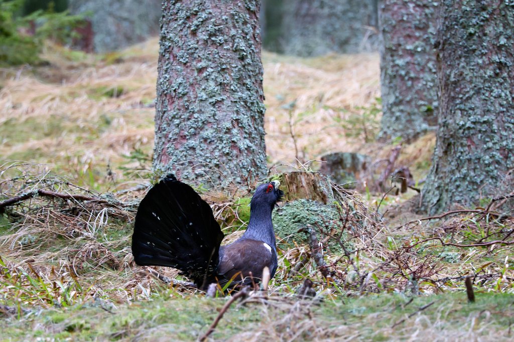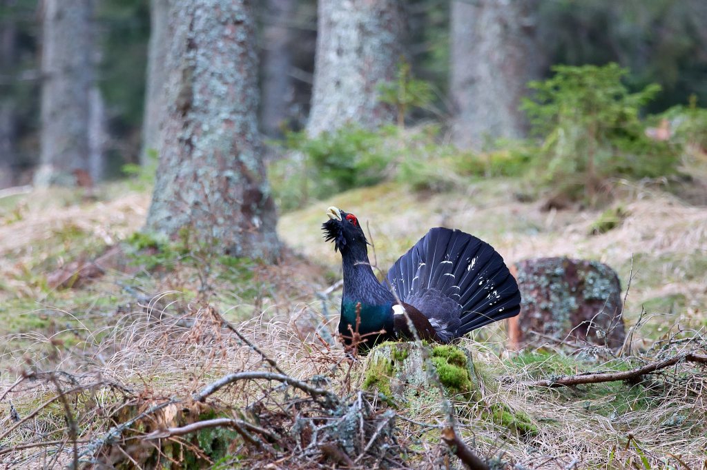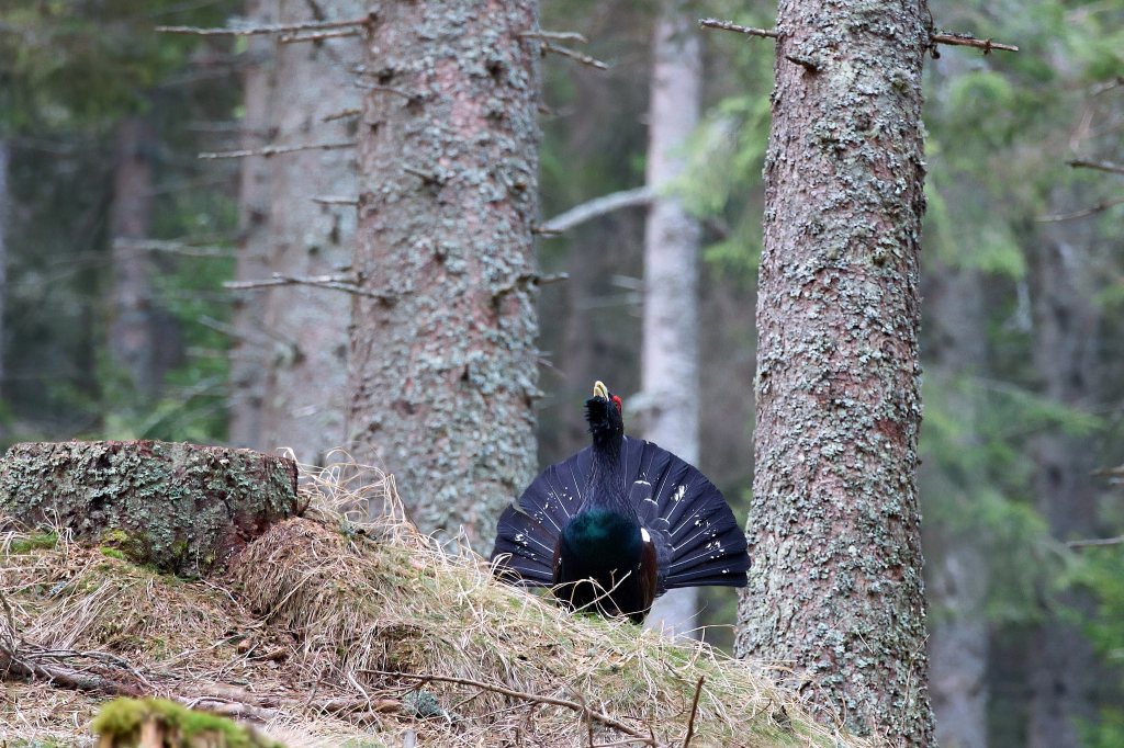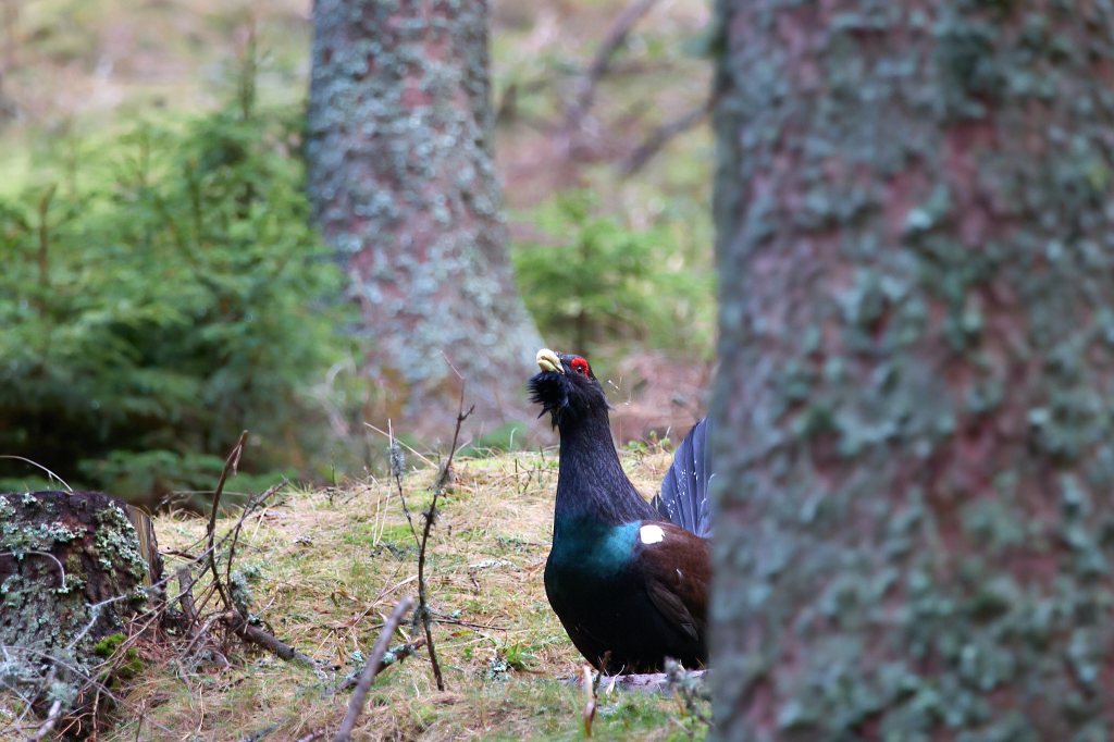 Dann kommt die Nachricht vom anderen Zelt, dass sie wohl hinter uns den Hang hinaufkommen. Und dann hört man schon das Flügelschlagen links von uns. Endlich sehe ich den dunklen Vogel, der mit breit gefächertem Schwanz und hoch gerecktem Hals zwischen den Bäumen auftaucht. Sehr auf seine Haltung bedacht, majestätisch und stolz setzt er einen Fuß vor den anderen. Bleibt kurz stehen, singt seine Strophen, dreht sich nach allen Seiten und flattert, springt wieder ein Stück.