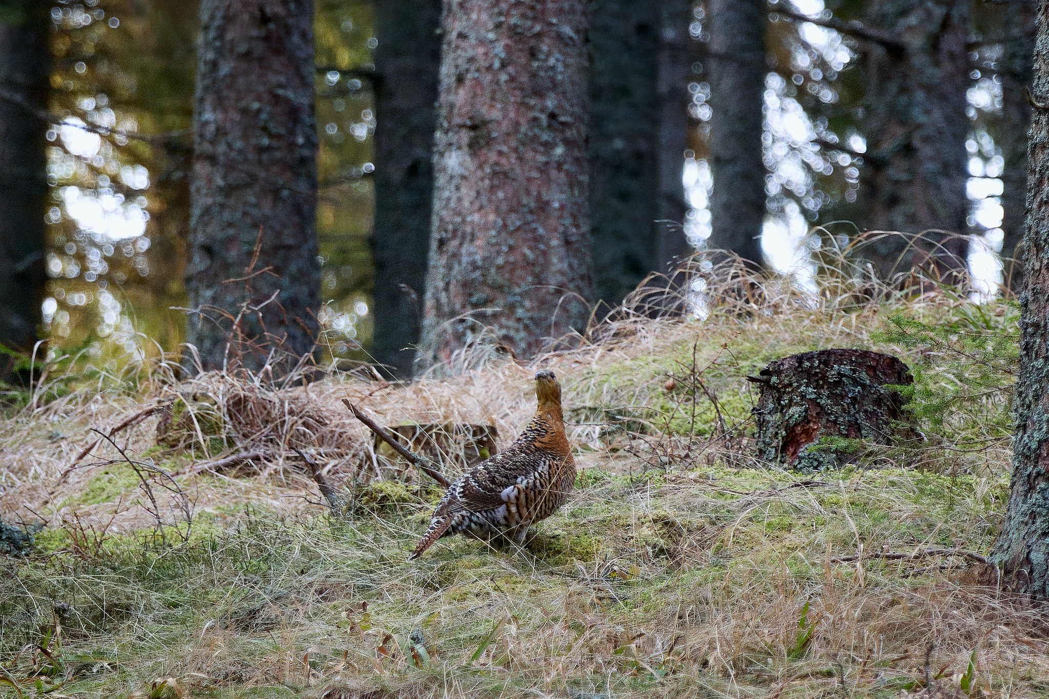 Weit entfernt ist zwischen den dunklen Baumstämmen der unterlegene Hahn zu sehen, der dort einsam seine Runden dreht und fast schon etwas verloren seinen Gesang in die dunklen Kronen der Fichten schickt.
