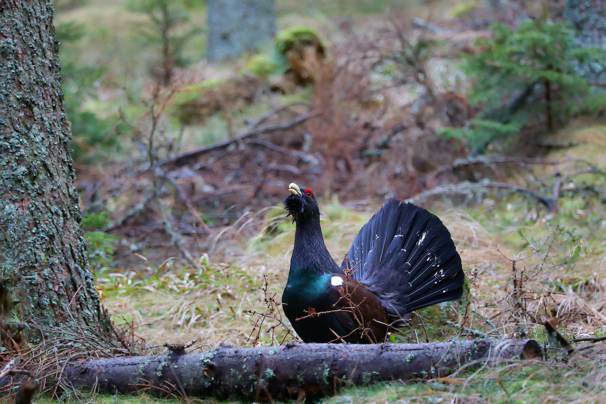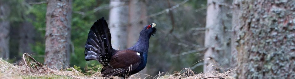 Dann kommt die Nachricht vom anderen Zelt, dass sie wohl hinter uns den Hang hinaufkommen. Und dann hört man schon das Flügelschlagen links von uns. Endlich sehe ich den dunklen Vogel, der mit breit gefächertem Schwanz und hoch gerecktem Hals zwischen den Bäumen auftaucht. Sehr auf seine Haltung bedacht, majestätisch und stolz setzt er einen Fuß vor den anderen. Bleibt kurz stehen, singt seine Strophen, dreht sich nach allen Seiten und flattert, springt wieder ein Stück.