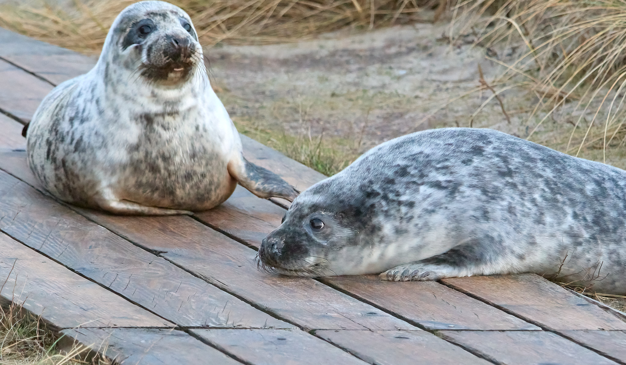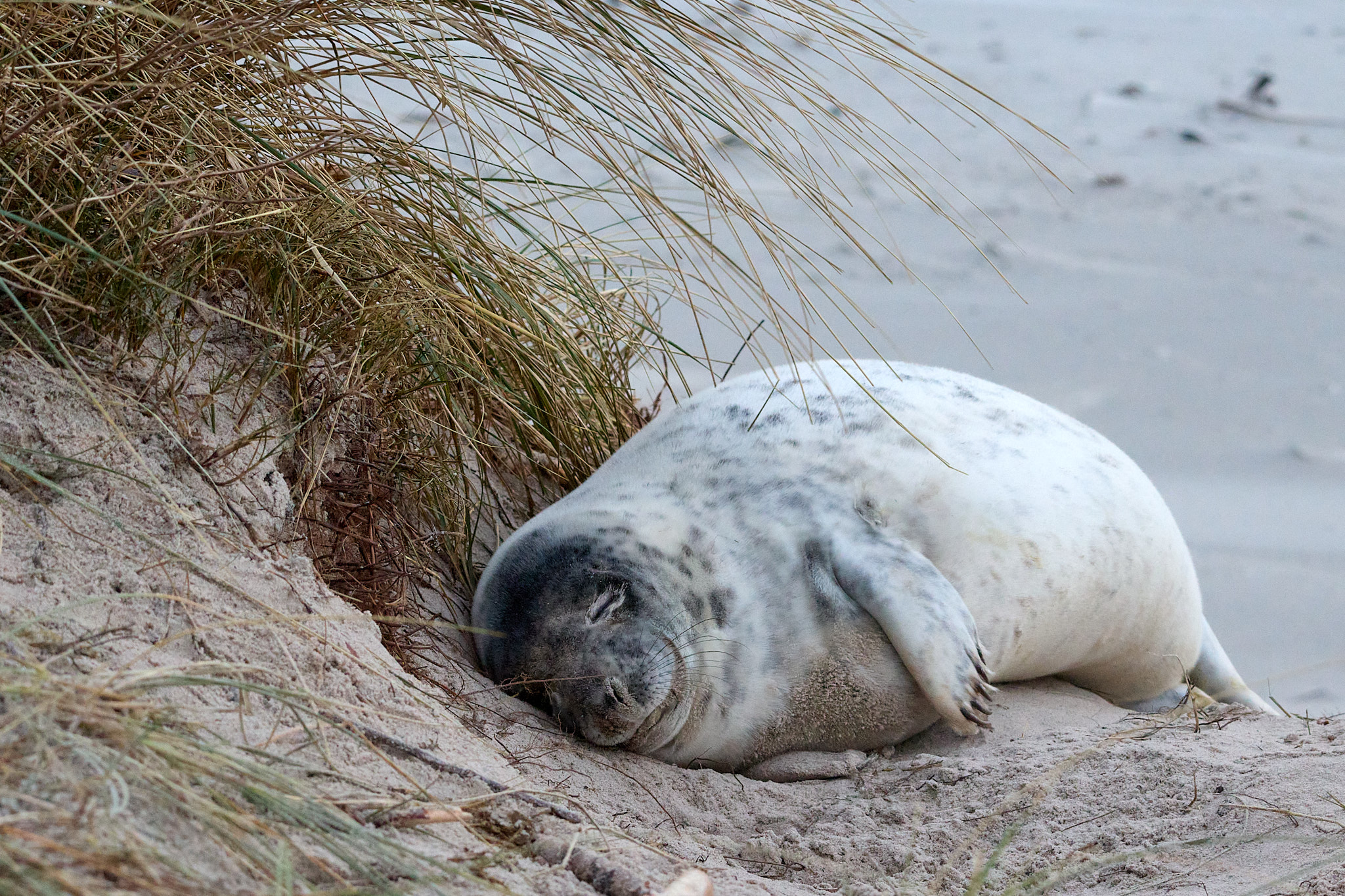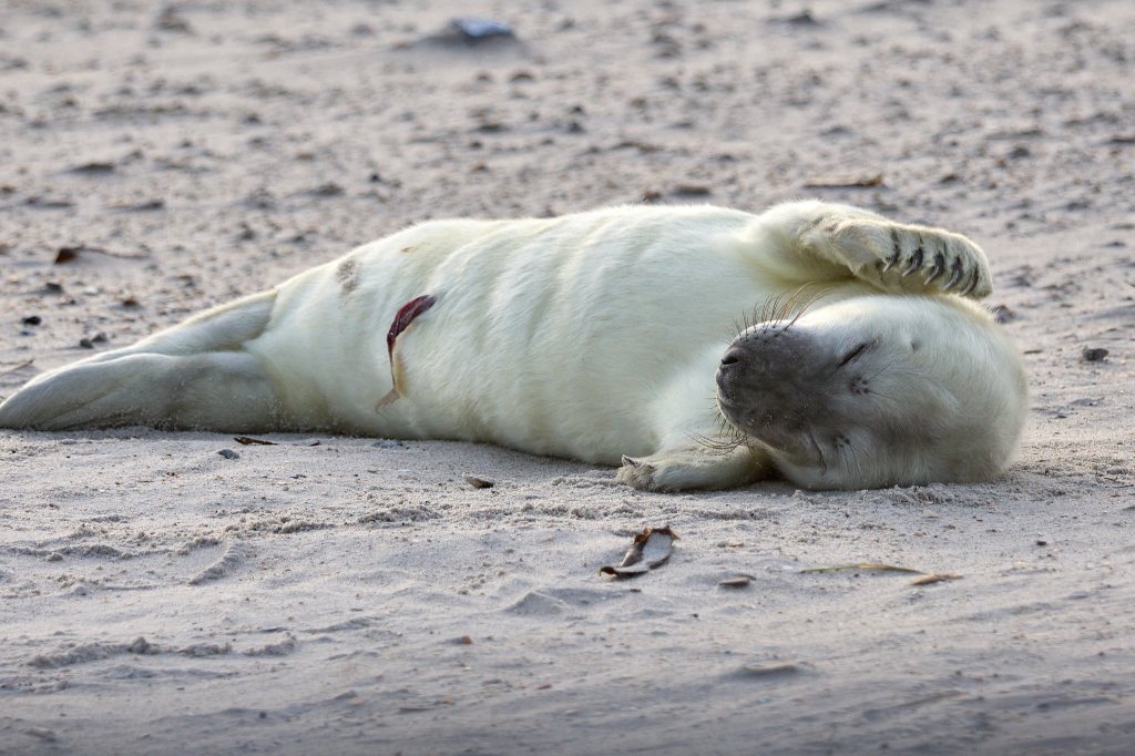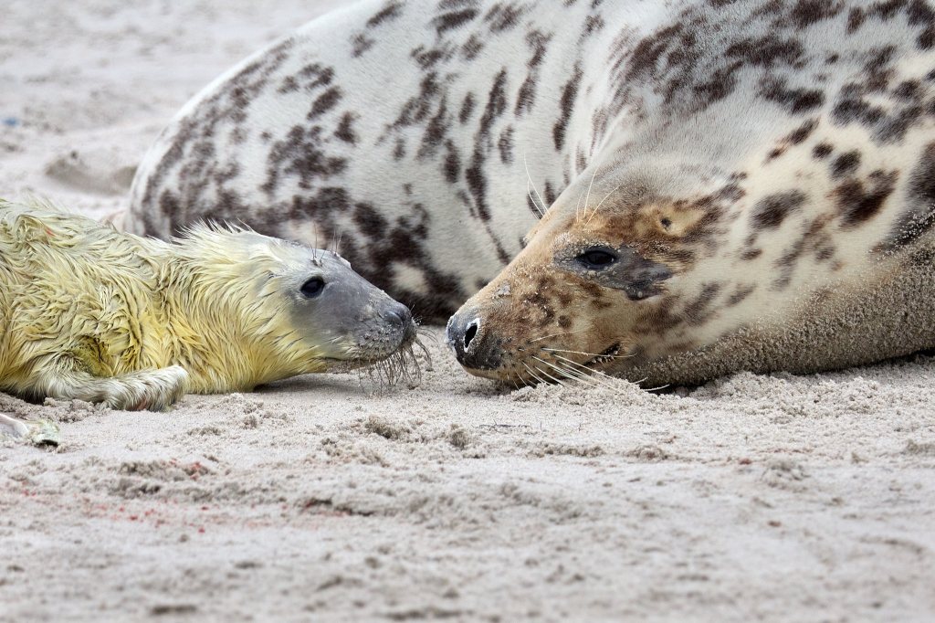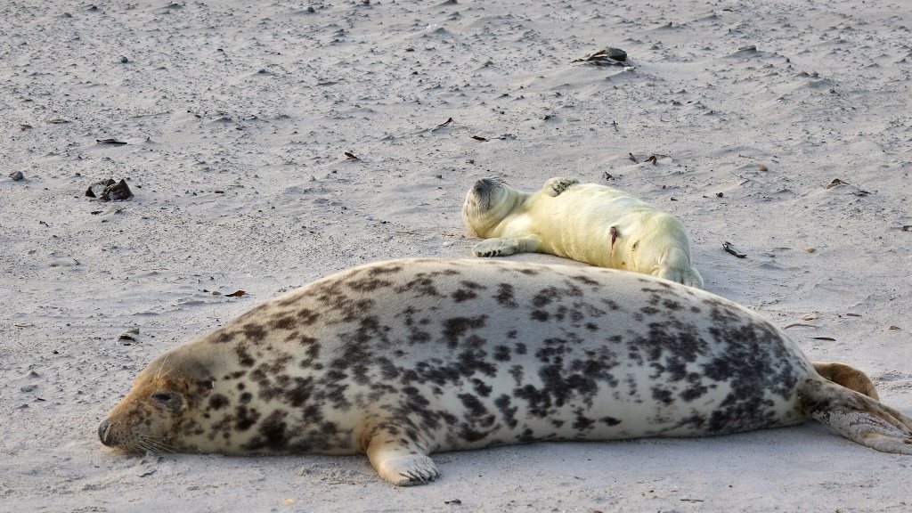 Am dritten Tag bin ich wieder unterwegs zum Südstrand. Ich bin gespannt, was aus dem Neuankömmling geworden ist. Zu meiner Freude liegt er friedlich noch fast an der gleichen Stelle neben seiner Mutter. Beide dösen vor sich hin, nur ab und zu machen sie einen Blick in die Runde. Es scheint ihm gut zu gehen, dem Kleinen. Ganz flauschig ist er nun und er kommt mir auch schon etwas runder vor als am ersten Tag. Am Liebsten würde ich ihn in den Arm nehmen und vor der großen weiten Welt mit all seinen Gefahren, die auf ihn zukommen, beschützen. Statt dessen schicke ich ihm ein paar positive Gedanken und gute Wünsche. Und genieße einfach den Anblick dieses kleinen Wunders.