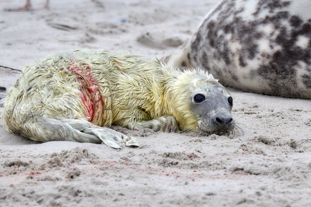 Nachdem ich mich von den ersten Exemplaren am Beginn des Strandes losgerissen und gefühlt mindestens schon 100 Fotos geschossen habe, entdecke ich ein paar Meter weiter eine kleine Sensation: eines dieser Wesen hat wohl gerade erst das Licht der Welt erblickt. Das weiße Fell ist noch ganz nass und hat einen grünlichen Schimmer vom Fruchtwasser. Die Nabelschnur ist als blutiger Stumpf erkennbar, das Fell noch teilweise rot vom Blut. Aber es schaut schon mit wachen Augen auf die vielen Kameras, die auf es gerichtet sind. Die Mama liegt sichtlich erschöpft daneben und versucht eher halbherzig, die Möwen und Krähen zu vertreiben, die sich um die Nachgeburt streiten.