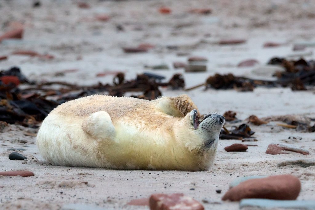 Kegelrobbenkinder werden nach der Geburt von ihren Müttern nur zwei bis drei Wochen gesäugt. In dieser Zeit verdreifachen sie ihr Körpergewicht und sind am Ende wirklich kugelrund und von einem schönen Fettpolster umgeben. Von diesen Fettreserven müssen sie dann auch zehren, bis sie in der Lage sind, sich selbst zu versorgen. Denn nachdem sie abgesäugt sind, verlässt sie ihre Mutter und sie sind auf sich allein gestellt.