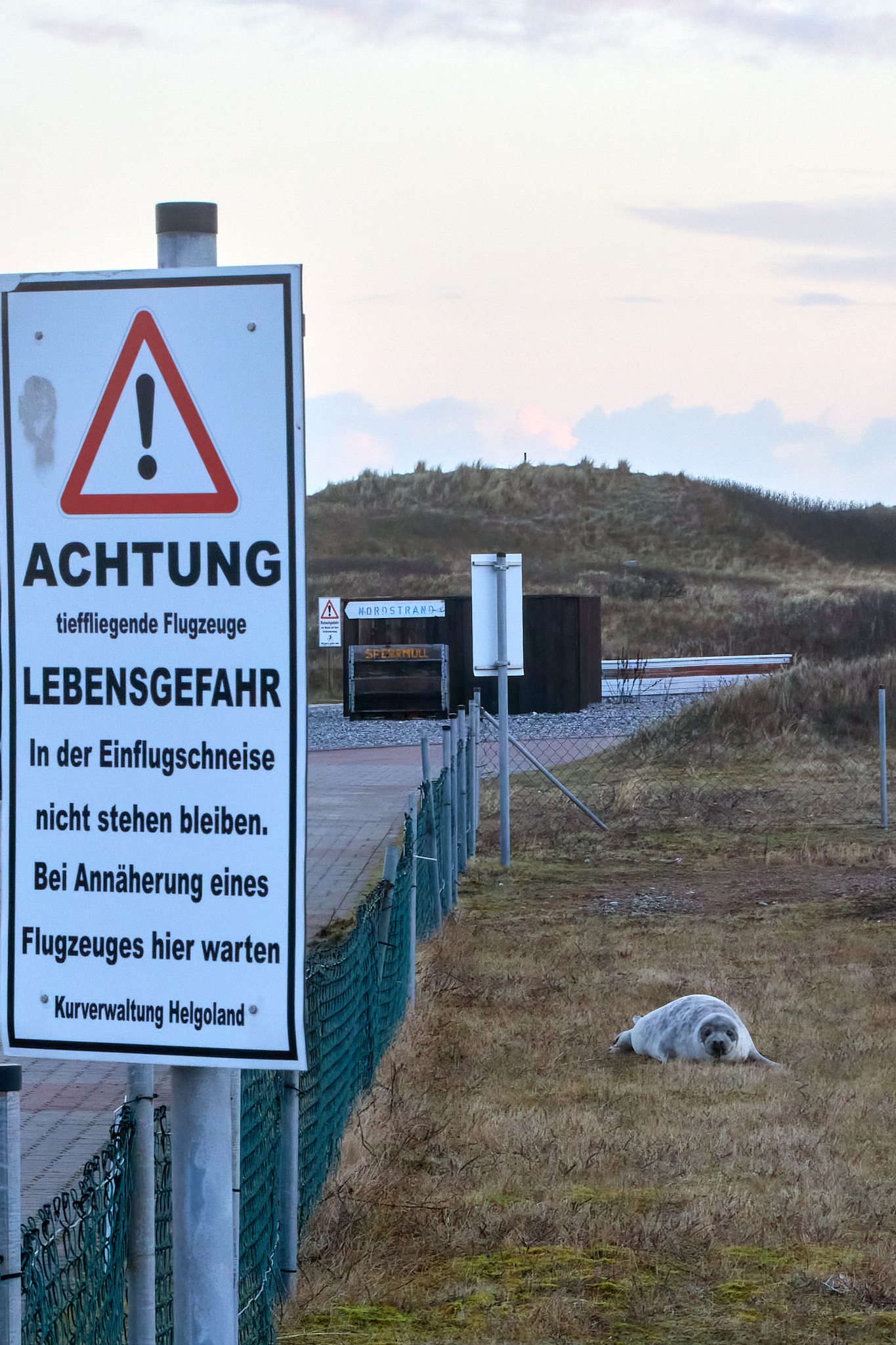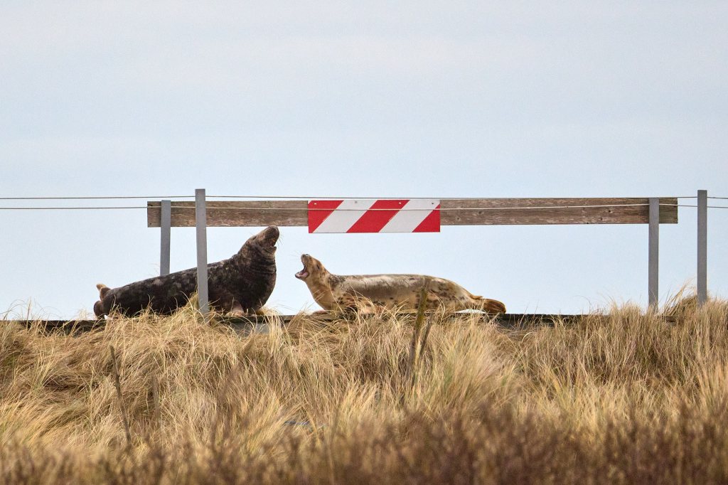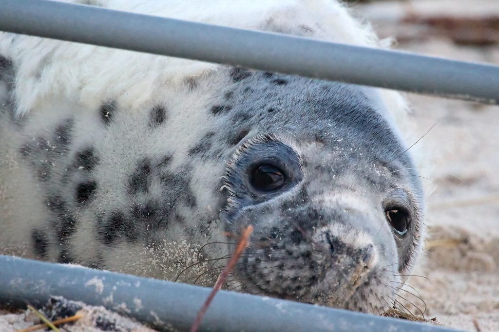 Nach einer kurzen, wackeligen Überfahrt marschiere ich den kleinen Hafen entlang Richtung Südstrand. Hier ist zum Schutz der Robben (und der Besucher) seit dem letzten Jahr ein Metallzaun aufgestellt, damit genügend Abstand eingehalten werden kann. Allerdings scheinen die kleinen Robben nicht viel von einem Sicherheitsabstand zu halten, denn sie schmiegen sich richtig an die Gitterstäbe. Gleich auf den ersten Metern entdecke ich drei runde Fellknäuel mit herzallerliebsten Knopfaugen, die im Sand – im wahrsten Sinne des Wortes – herumkugeln. Zwischendurch gähnen sie herzhaft, winken mit den kleinen Flossen oder lassen ab und zu traurige Rufe hören, die ihnen wohl auch den Spitznamen „Heuler“ beschert haben.