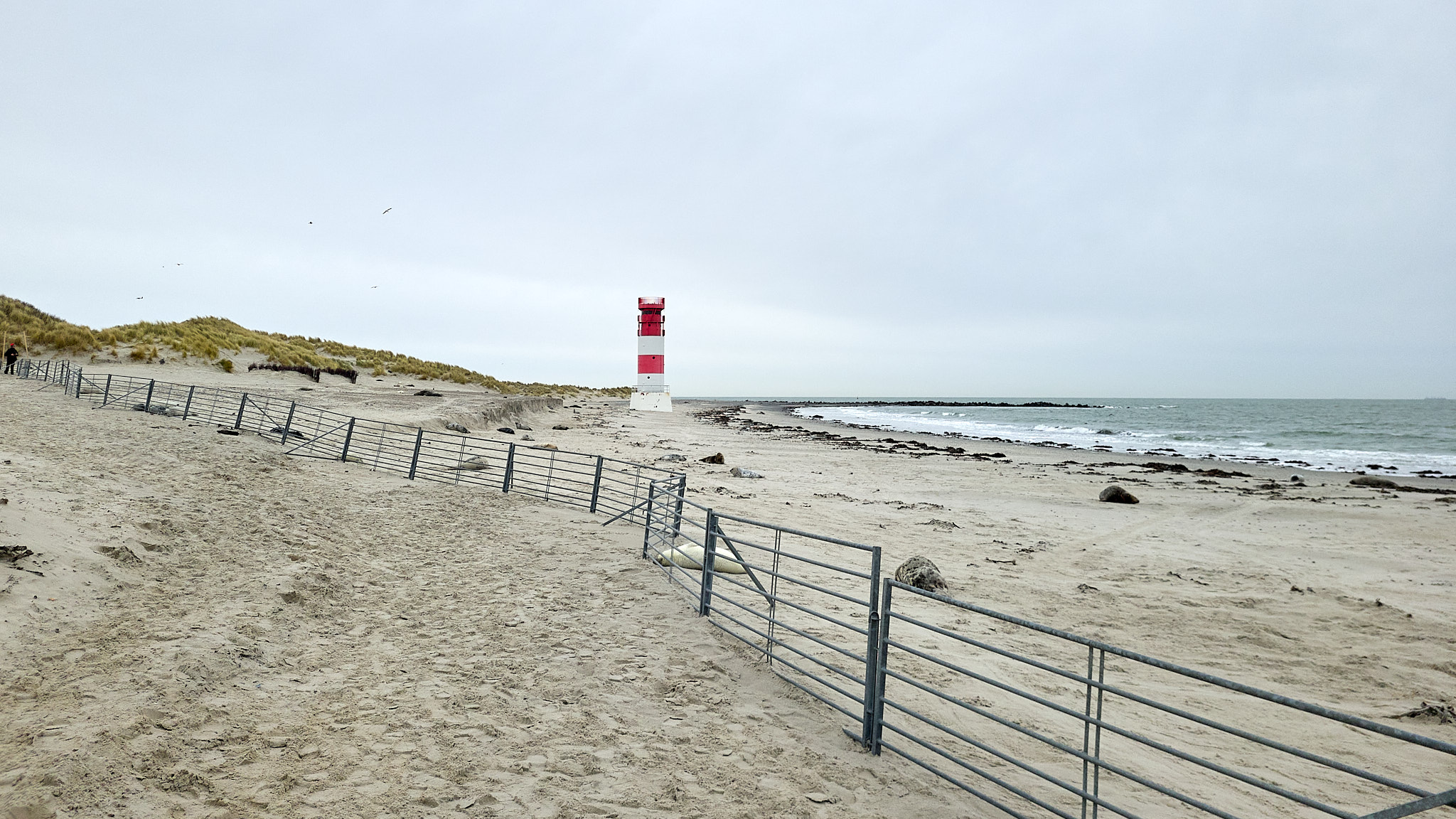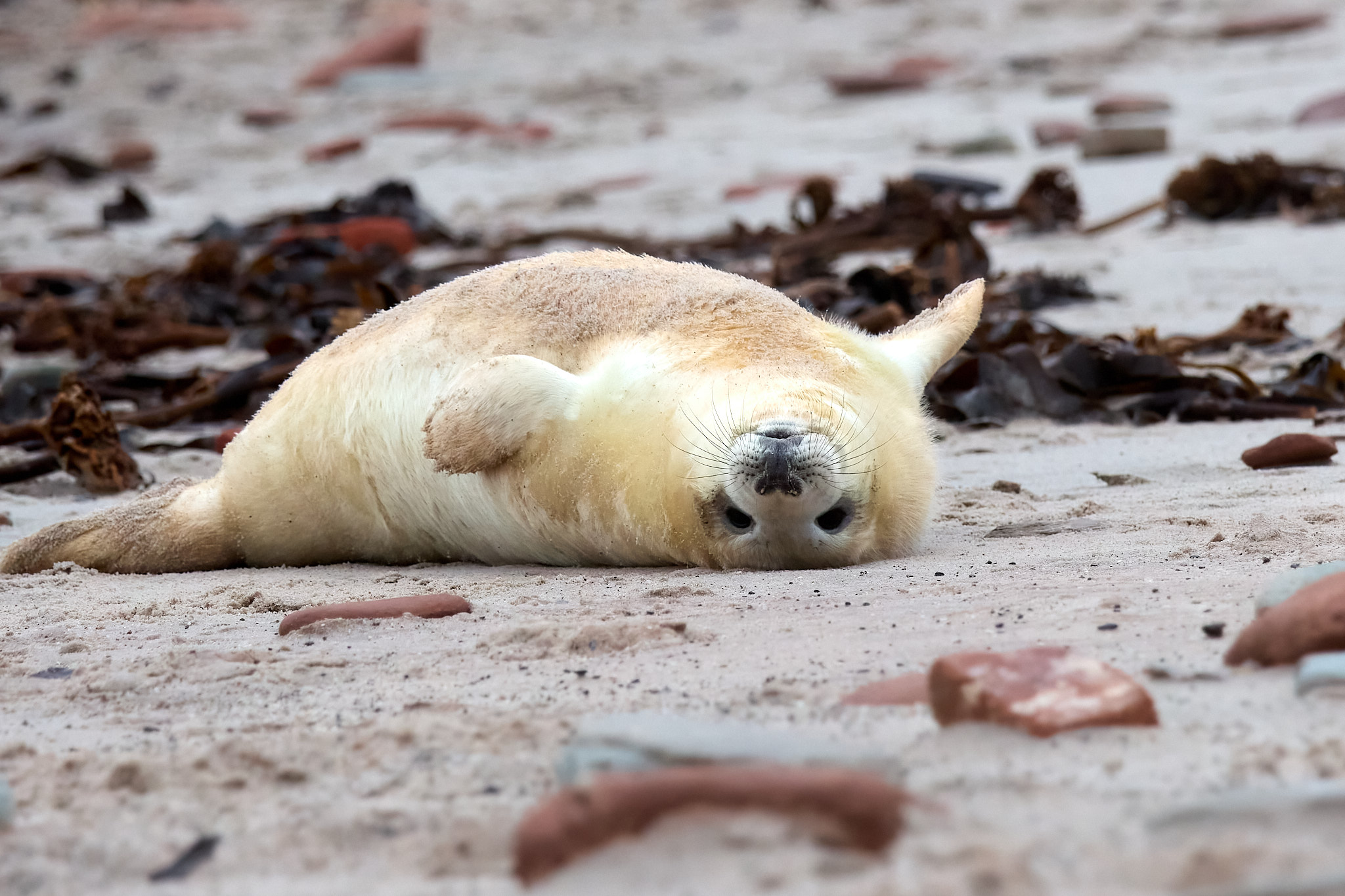 Die nächsten zwei Tage ist es so stürmisch, dass keine Fähre zur Düne überfährt. Ich vertreibe mir die Zeit am Nordstrand der Hauptinsel, wo es selbst im Dezember noch ein paar Wattvögel zu fotografieren gibt. Und auch hier kugeln ein paar kleine Robben am Strand herum oder kämpfen sich durch die Brandung bis zu den schützenden Dünen.