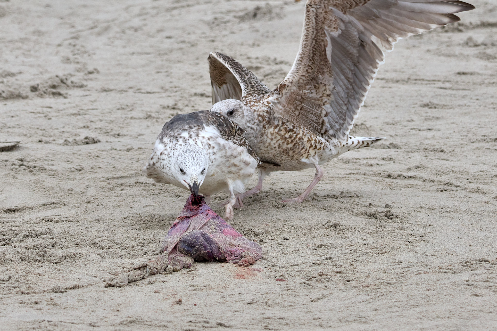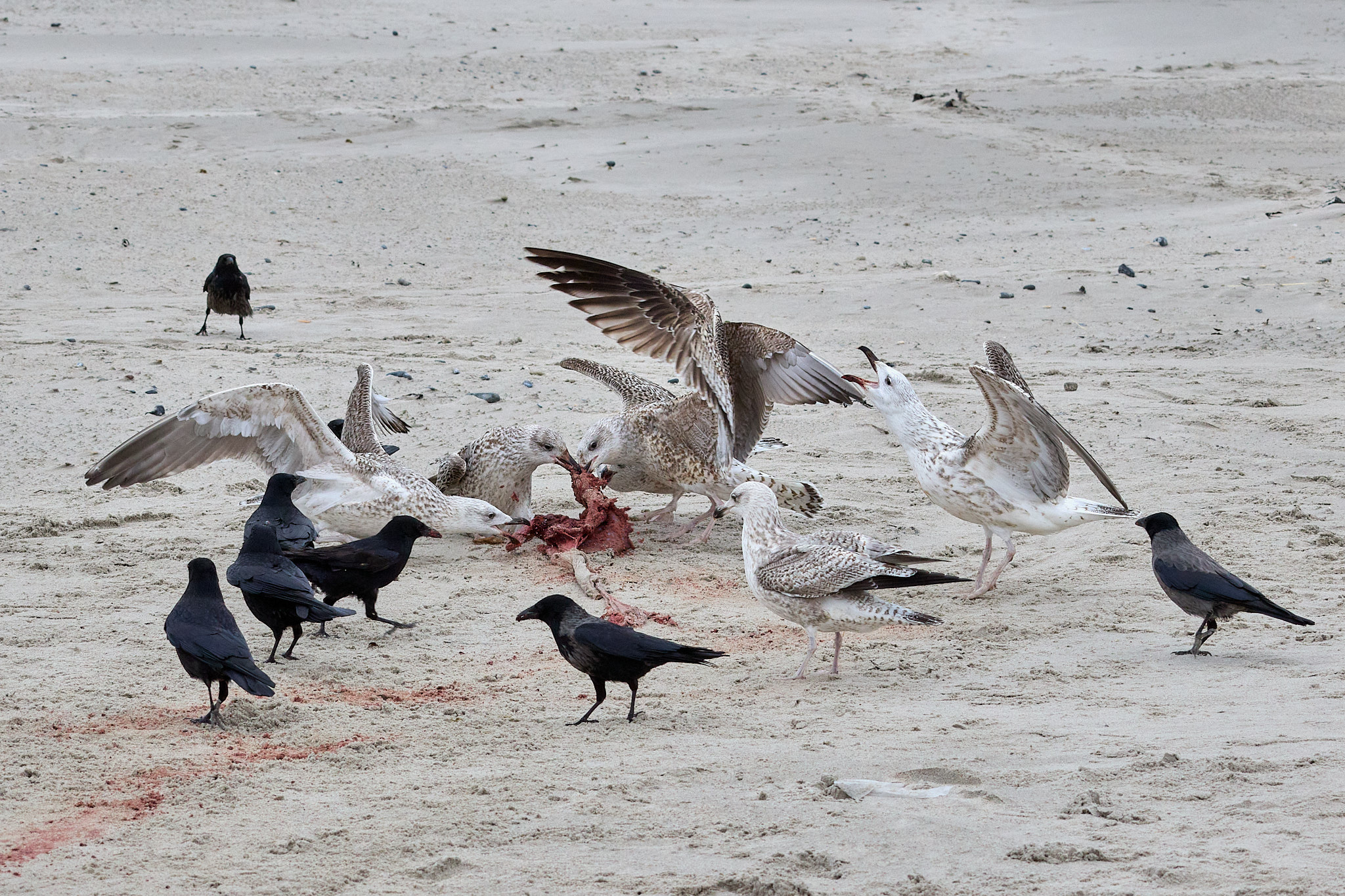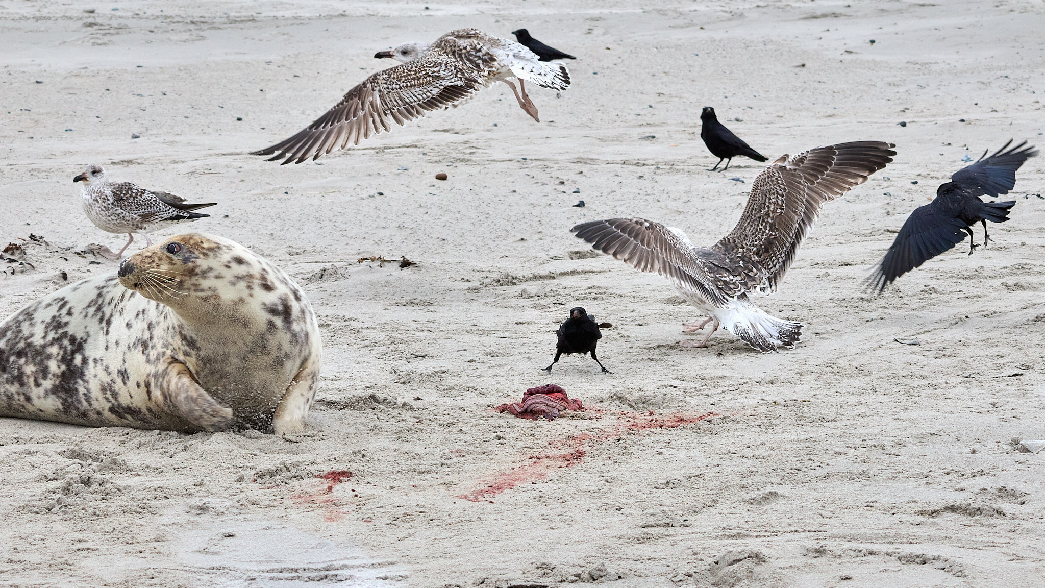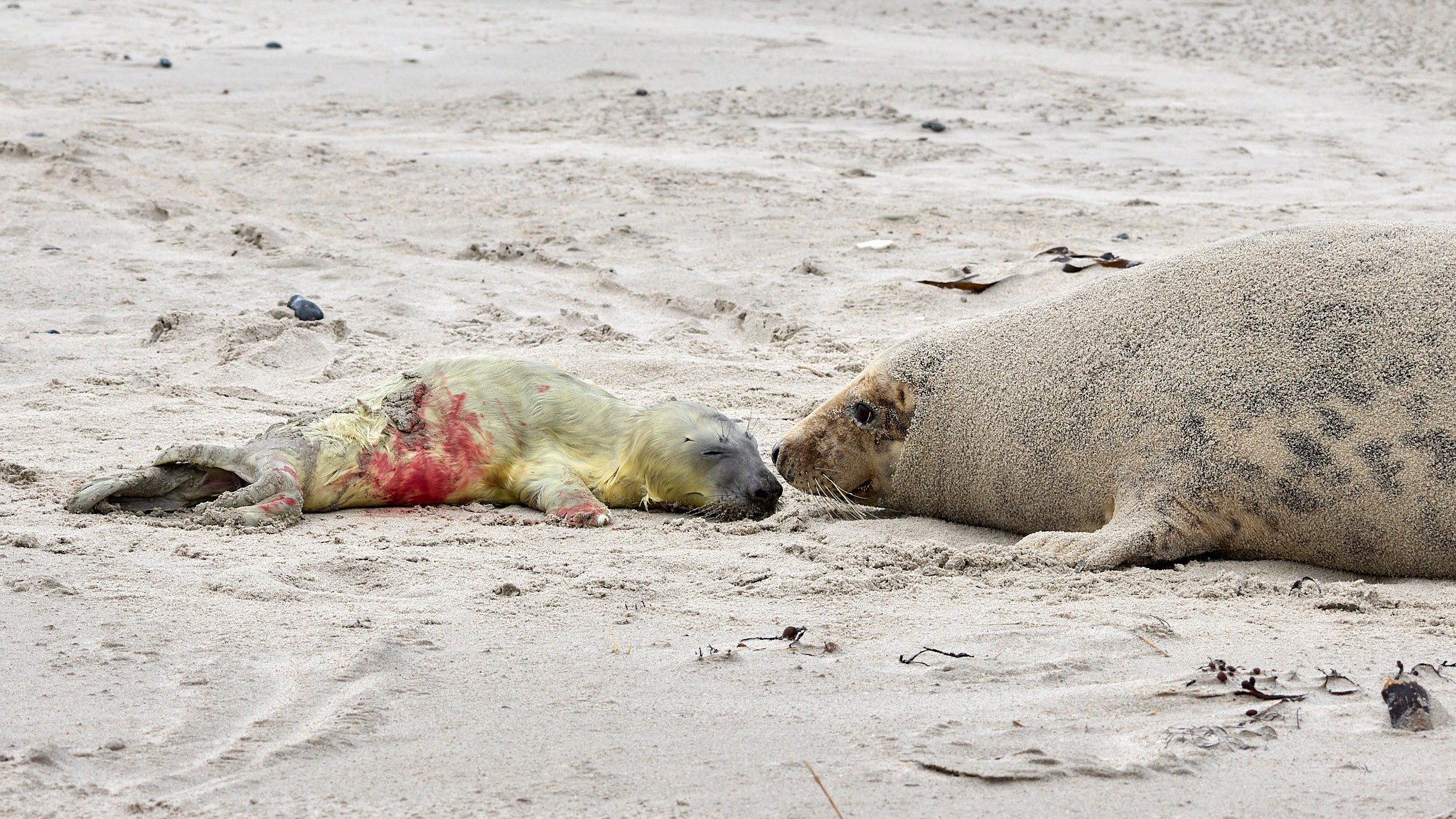Nachdem ich mich von den ersten Exemplaren am Beginn des Strandes losgerissen und gefühlt mindestens schon 100 Fotos geschossen habe, entdecke ich ein paar Meter weiter eine kleine Sensation: eines dieser Wesen hat wohl gerade erst das Licht der Welt erblickt. Das weiße Fell ist noch ganz nass und hat einen grünlichen Schimmer vom Fruchtwasser. Die Nabelschnur ist als blutiger Stumpf erkennbar, das Fell noch teilweise rot vom Blut. Aber es schaut schon mit wachen Augen auf die vielen Kameras, die auf es gerichtet sind. Die Mama liegt sichtlich erschöpft daneben und versucht eher halbherzig, die Möwen und Krähen zu vertreiben, die sich um die Nachgeburt streiten.