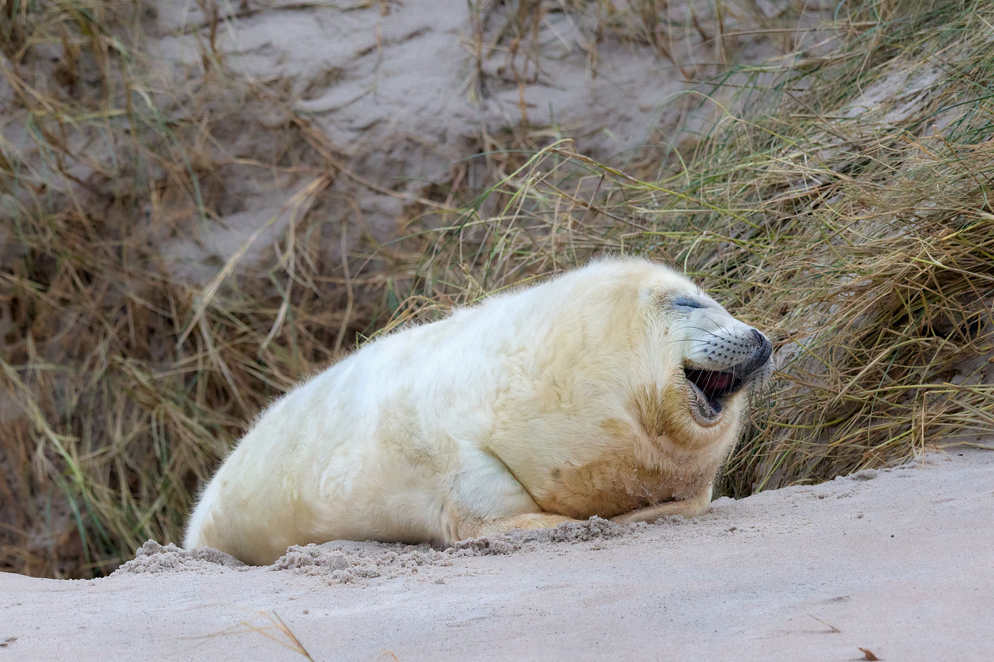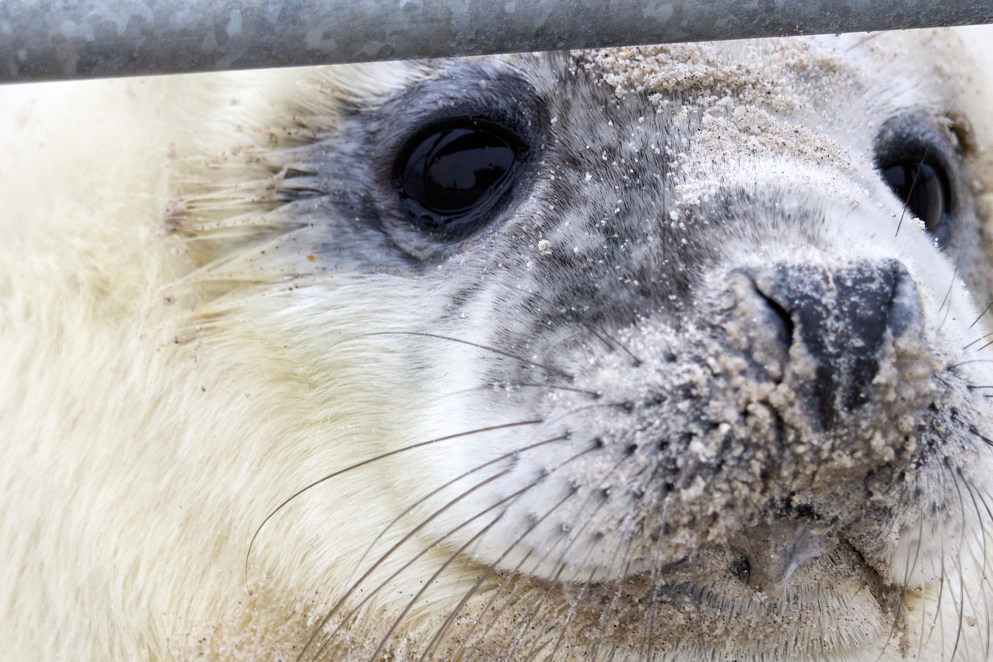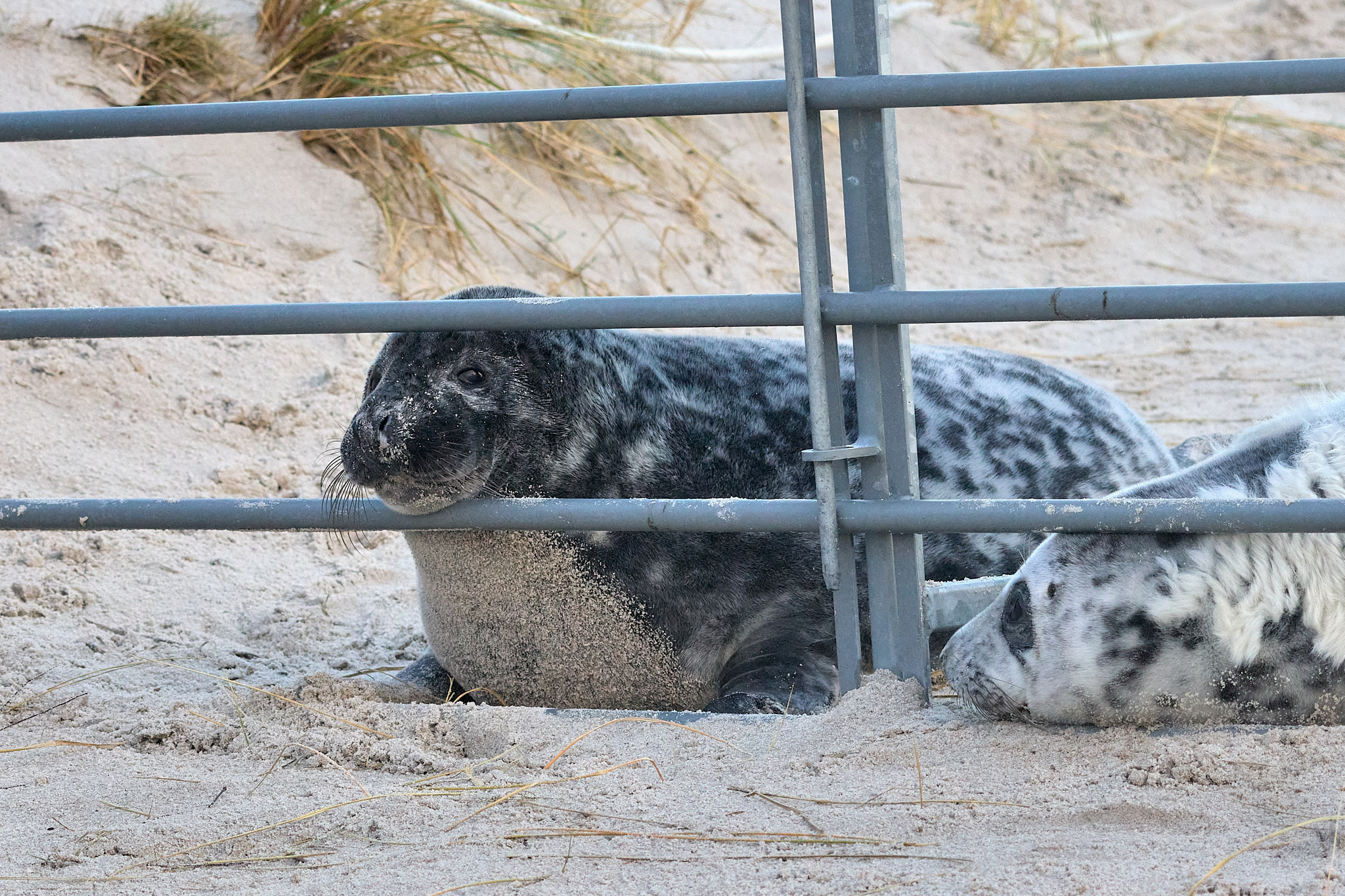 Nach einer kurzen, wackeligen Überfahrt marschiere ich den kleinen Hafen entlang Richtung Südstrand. Hier ist zum Schutz der Robben (und der Besucher) seit dem letzten Jahr ein Metallzaun aufgestellt, damit genügend Abstand eingehalten werden kann. Allerdings scheinen die kleinen Robben nicht viel von einem Sicherheitsabstand zu halten, denn sie schmiegen sich richtig an die Gitterstäbe. Gleich auf den ersten Metern entdecke ich drei runde Fellknäuel mit herzallerliebsten Knopfaugen, die im Sand – im wahrsten Sinne des Wortes – herumkugeln. Zwischendurch gähnen sie herzhaft, winken mit den kleinen Flossen oder lassen ab und zu traurige Rufe hören, die ihnen wohl auch den Spitznamen „Heuler“ beschert haben.