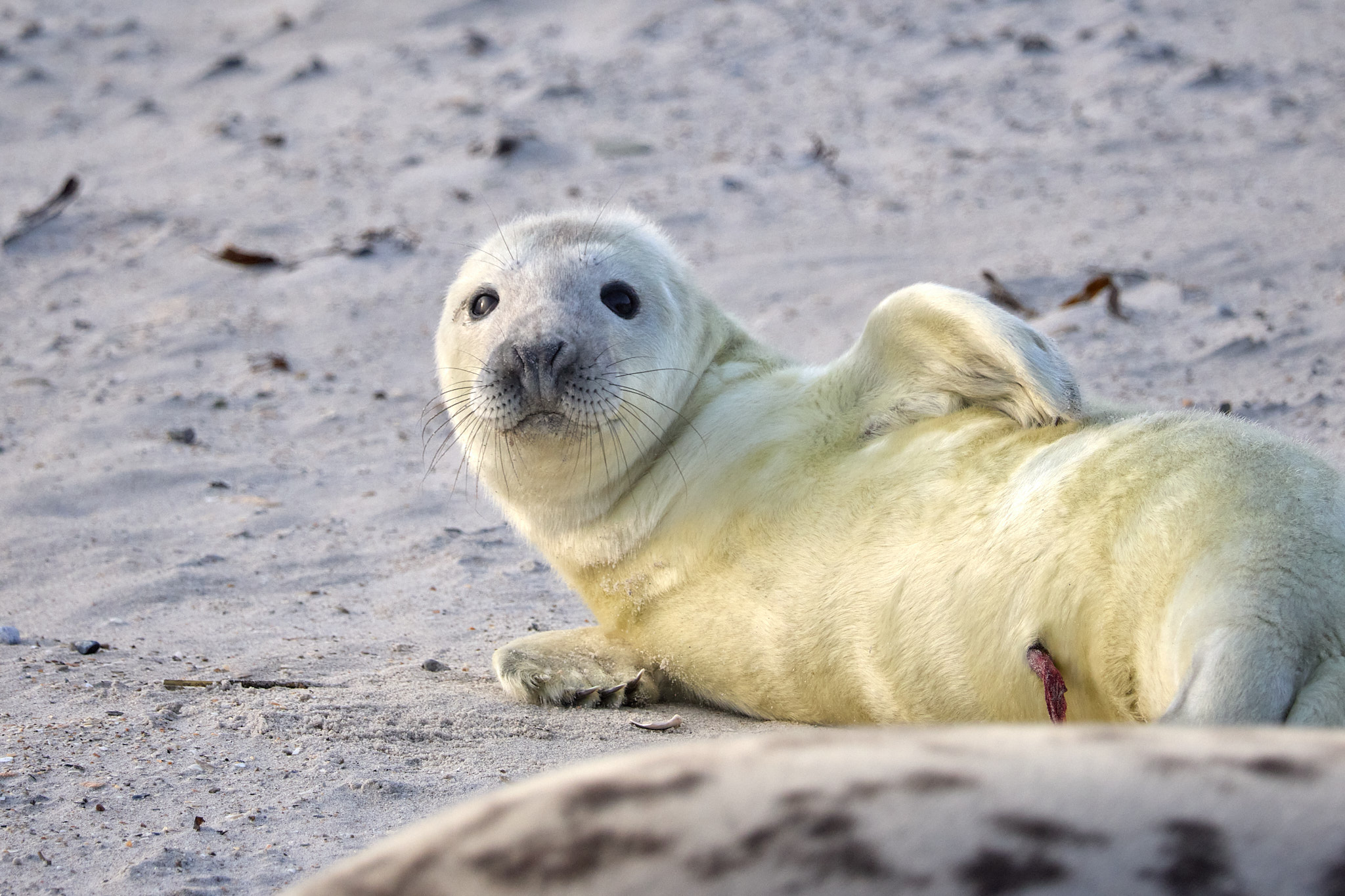 Am dritten Tag bin ich wieder unterwegs zum Südstrand. Ich bin gespannt, was aus dem Neuankömmling geworden ist. Zu meiner Freude liegt er friedlich noch fast an der gleichen Stelle neben seiner Mutter. Beide dösen vor sich hin, nur ab und zu machen sie einen Blick in die Runde. Es scheint ihm gut zu gehen, dem Kleinen. Ganz flauschig ist er nun und er kommt mir auch schon etwas runder vor als am ersten Tag. Am Liebsten würde ich ihn in den Arm nehmen und vor der großen weiten Welt mit all seinen Gefahren, die auf ihn zukommen, beschützen. Statt dessen schicke ich ihm ein paar positive Gedanken und gute Wünsche. Und genieße einfach den Anblick dieses kleinen Wunders.