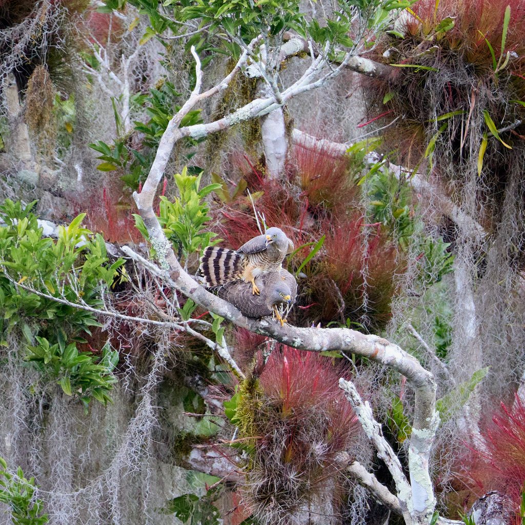 Langsam mischt sich das aufgeregte Rufen der Papageien in das Gebrüll der Affen. Fast auf Augenhöhe fliegen sie an uns vorbei, um sich in einem der Äste niederzulassen. Vor uns sitzt eine Wegebussard-Dame malerisch von roten Flechten umgeben und wartet geduldig, bis der Herr kurz zum Liebe-machen vorbeikommt.