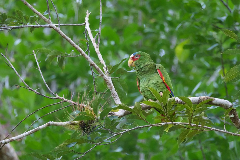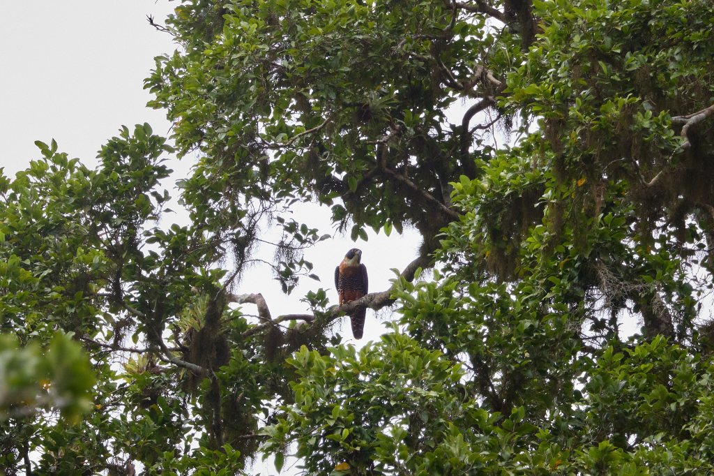 Dann macht uns Roland auf das Rotbrustfalken-Pärchen aufmerksam, das ganz oben auf den Steinen der großen Pyramide sitzt – gerade noch als Silhouetten durch das Spektiv zu erkennen, das Weibchen deutlich größer als ihr Partner. Diese Art gehört zu den seltensten Falken Mittel- und Südamerikas und ist nur wenig erforscht. Hier in Tikal, das nicht nur UNESCO Welterbe ist, sondern auch Nationalpark, brütet dieses eine Paar schon seit ein paar Jahren. Das gesamte Gebiet erstreckt sich über fast 65 Quadratkilometer, wobei es alleine im zentralen Bereich über 3.000 Bauten gibt. Und man schätzt, dass an die 10.000 Gebäude noch unter den Wurzeln des Dschungels verborgen sind. Und die meisten werden es wohl auch bleiben, da sich herausgestellt hat, dass sie so wesentlich besser vor Witterungseinflüssen (und den Touristen) geschützt sind.