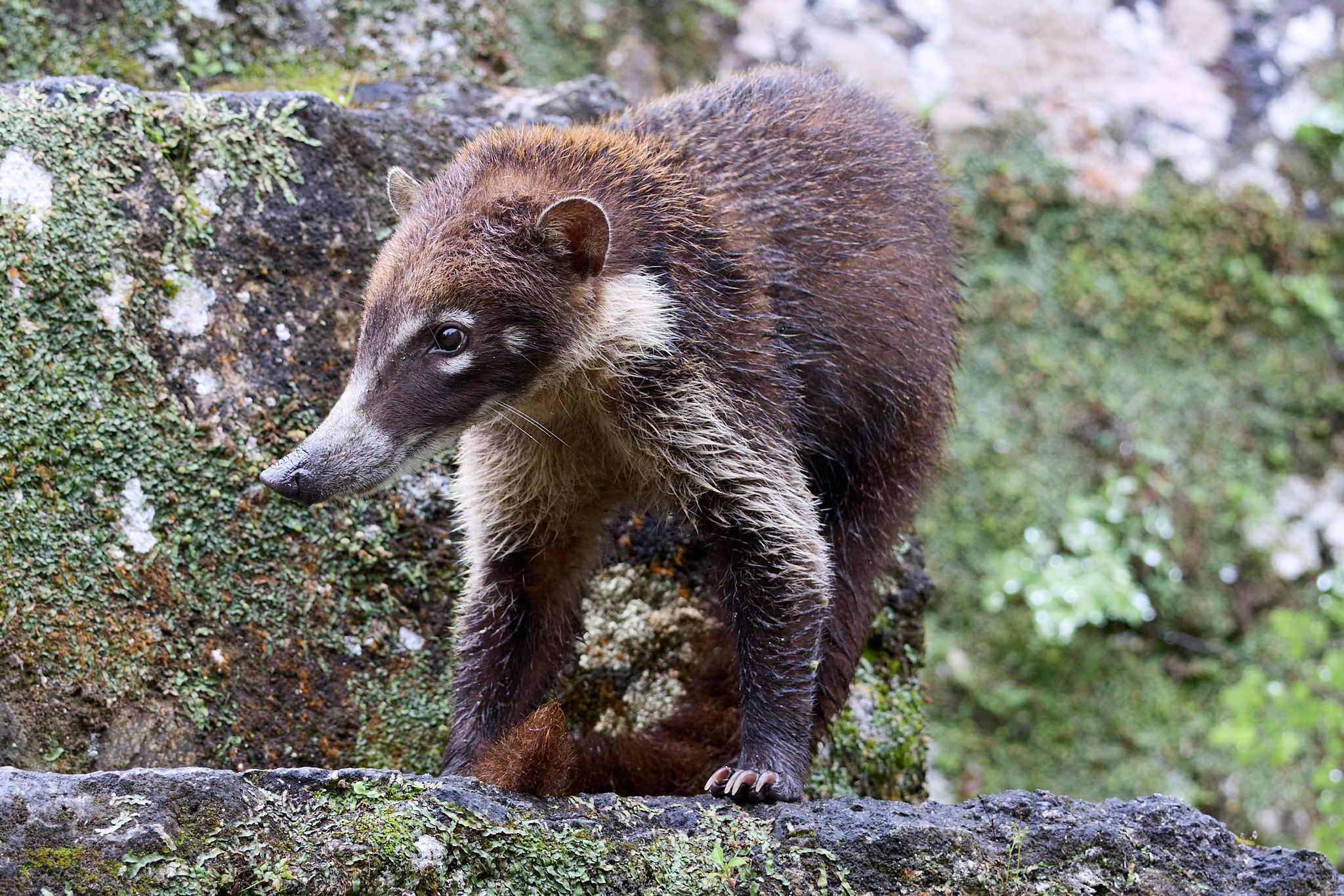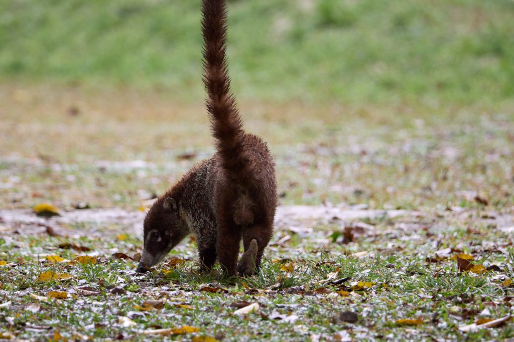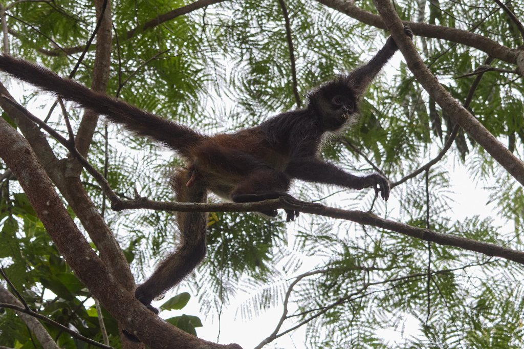 Mittlerweile ist der neue Tag vollends angebrochen und die ersten Besucher kommen über die steilen Stufen zu uns hinauf. Wir steigen langsam wieder hinunter und bewundern dabei ein paar Klammeraffen, die fast auf Augenhöhe durchs Geäst turnen. Mit ihren langen Armen und dem kräftigen Greifschwanz bewegen sie sich pendelnd durch das Laub der Bäume – nicht gerade geräuscharm – und es ist fast unmöglich, ein scharfes Foto von ihnen zu bekommen. Unten angekommen, bieten die neugierigen Nasenbären, die ziemlich geübt darin sind, essbare Beute in den Taschen der Urlauber zu erspähen, ein deutlich dankbareres Fotomotiv.