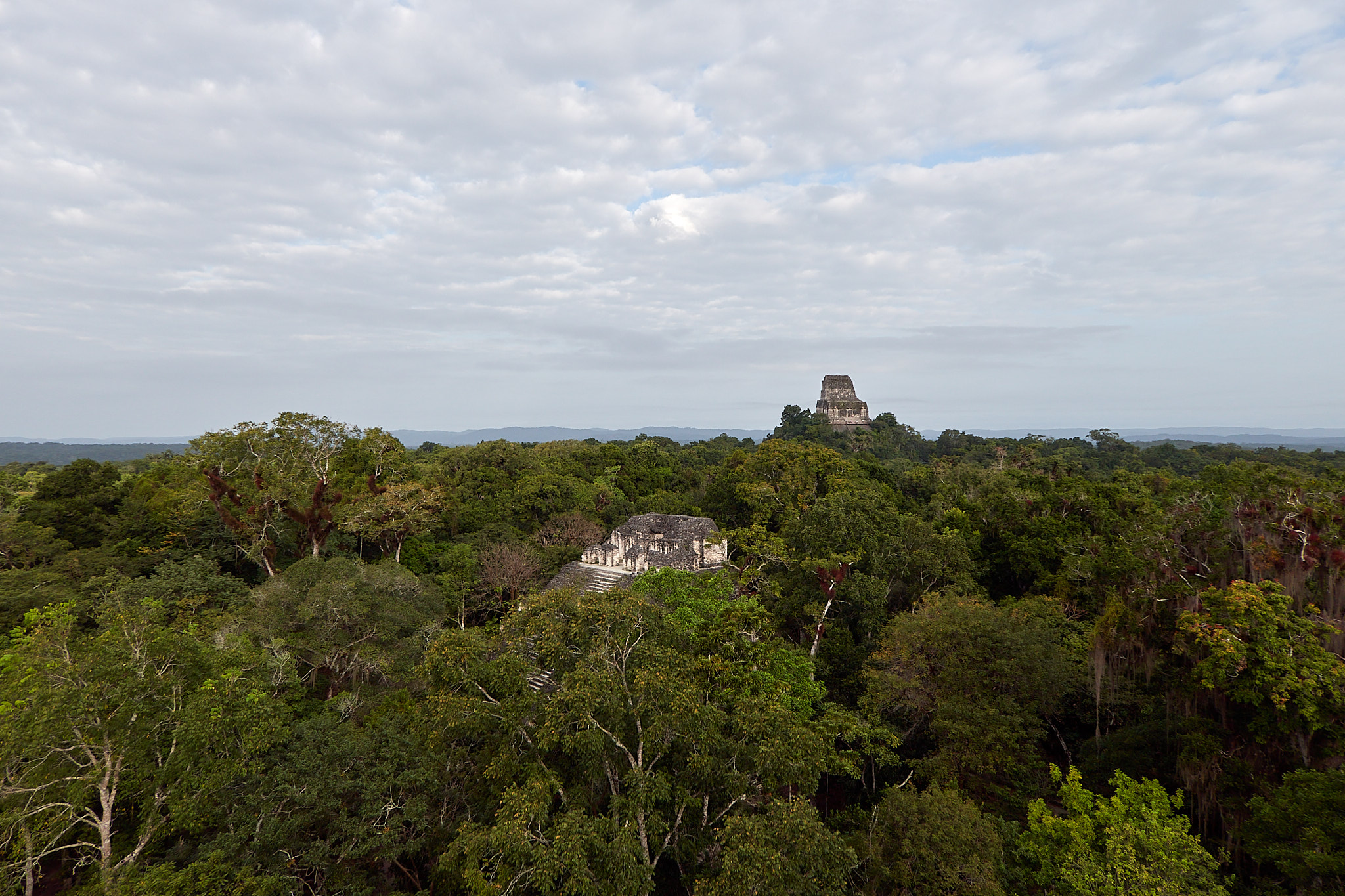 Und dann sind wir oben. Vor uns eröffnet sich ein traumhafter Blick über den grünen Urwald. Dazwischen ragen die verfallenen Türme der Pyramiden auf, Zeugen einer anderen, längst vergangenen Welt. Die unheimlichen Rufe der Brüllaffen füllen den anbrechenden Morgen. Doch ein kitschiger Sonnenaufgang wird es heute wohl nicht werden, das verhindern die Wolken. Aber auch so ist die Stimmung fast verwunschen, mit dem leichten Nebel und so hoch über den Baumkronen des Dschungels.