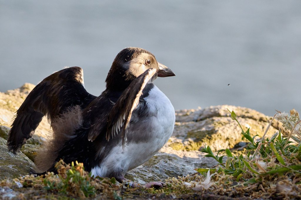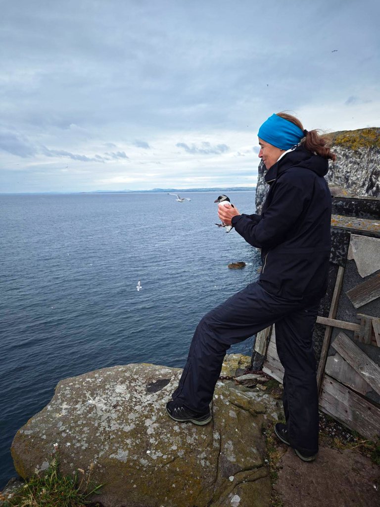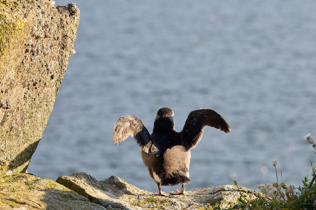 Doch bis auf einen sind alle bereit und so folge ich den anderen mit zwei zappelnden Stoffsäcken in der Hand zu den Cornerstone Klippen, wo wir die kleinen Papageientaucher ins Meer „werfen“ werden. Vorsichtig hole ich den nächsten Kandidaten wieder aus seinem Baumwollsäckchen und trete an den Rand der Klippen. Der Lärm um uns herum ist ohrenbetäubend: überall auf den Felsen sitzen brütende Vögel, Dreizehenmöwen begrüßen sich lautstark, Trottellummen streiten mit ihren Nachbarn und immer wieder mischt das tiefe „Rah, rah“ der Tordalks in das Spektakel (das mich immer ein bisschen an das Geräusch beim Ausfahren des Fahrgestells eines Flugzeugs erinnert).