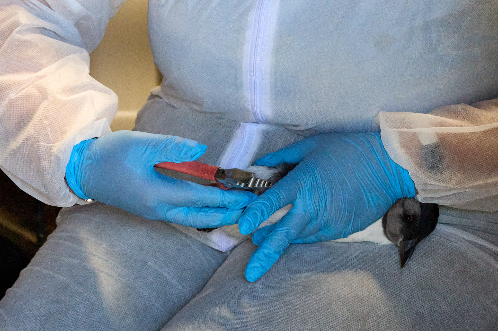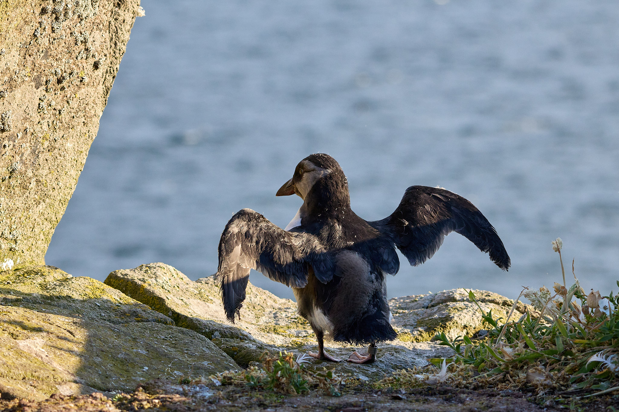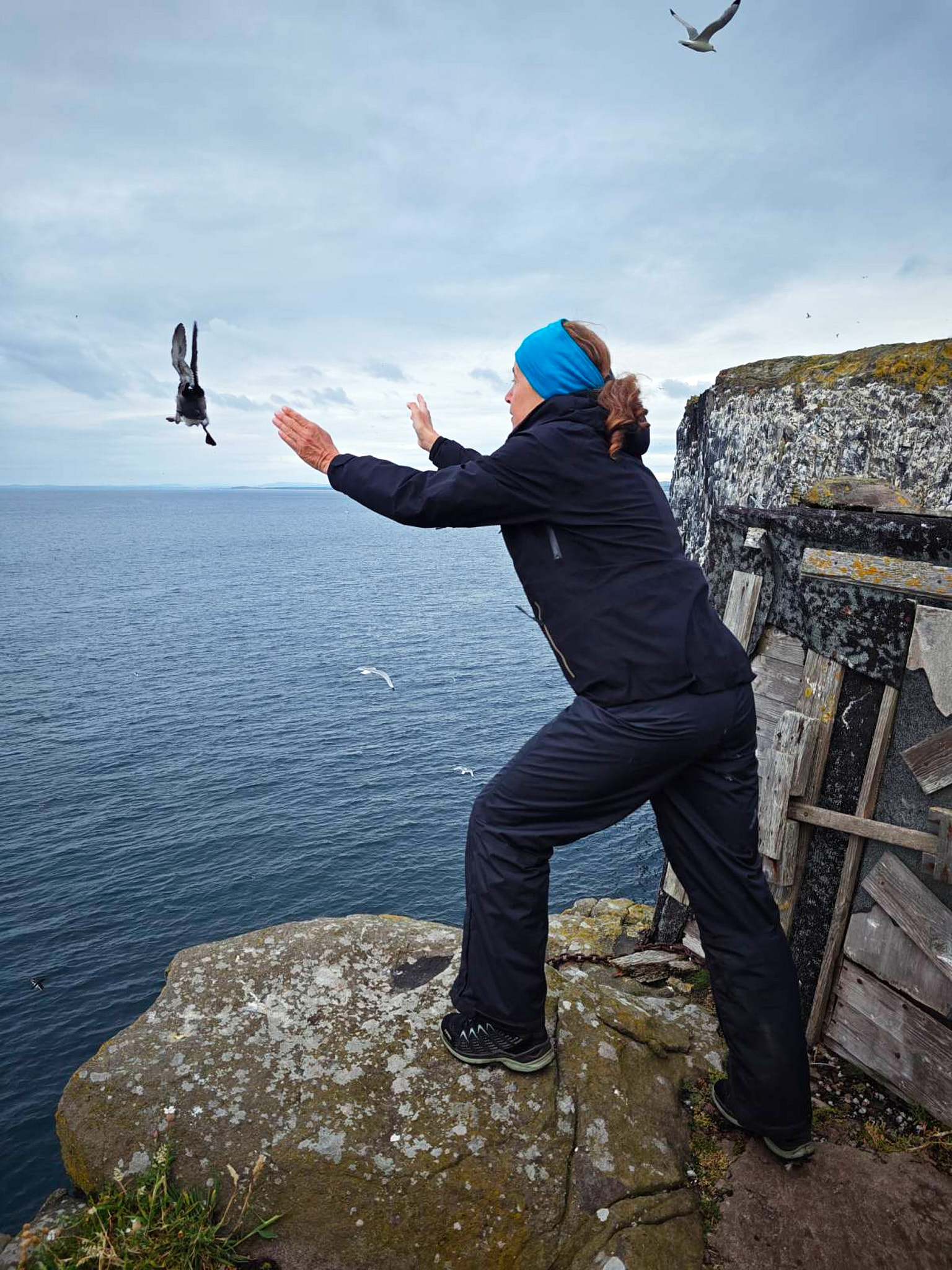 Doch bis auf einen sind alle bereit und so folge ich den anderen mit zwei zappelnden Stoffsäcken in der Hand zu den Cornerstone Klippen, wo wir die kleinen Papageientaucher ins Meer „werfen“ werden. Vorsichtig hole ich den nächsten Kandidaten wieder aus seinem Baumwollsäckchen und trete an den Rand der Klippen. Der Lärm um uns herum ist ohrenbetäubend: überall auf den Felsen sitzen brütende Vögel, Dreizehenmöwen begrüßen sich lautstark, Trottellummen streiten mit ihren Nachbarn und immer wieder mischt das tiefe „Rah, rah“ der Tordalks in das Spektakel (das mich immer ein bisschen an das Geräusch beim Ausfahren des Fahrgestells eines Flugzeugs erinnert).