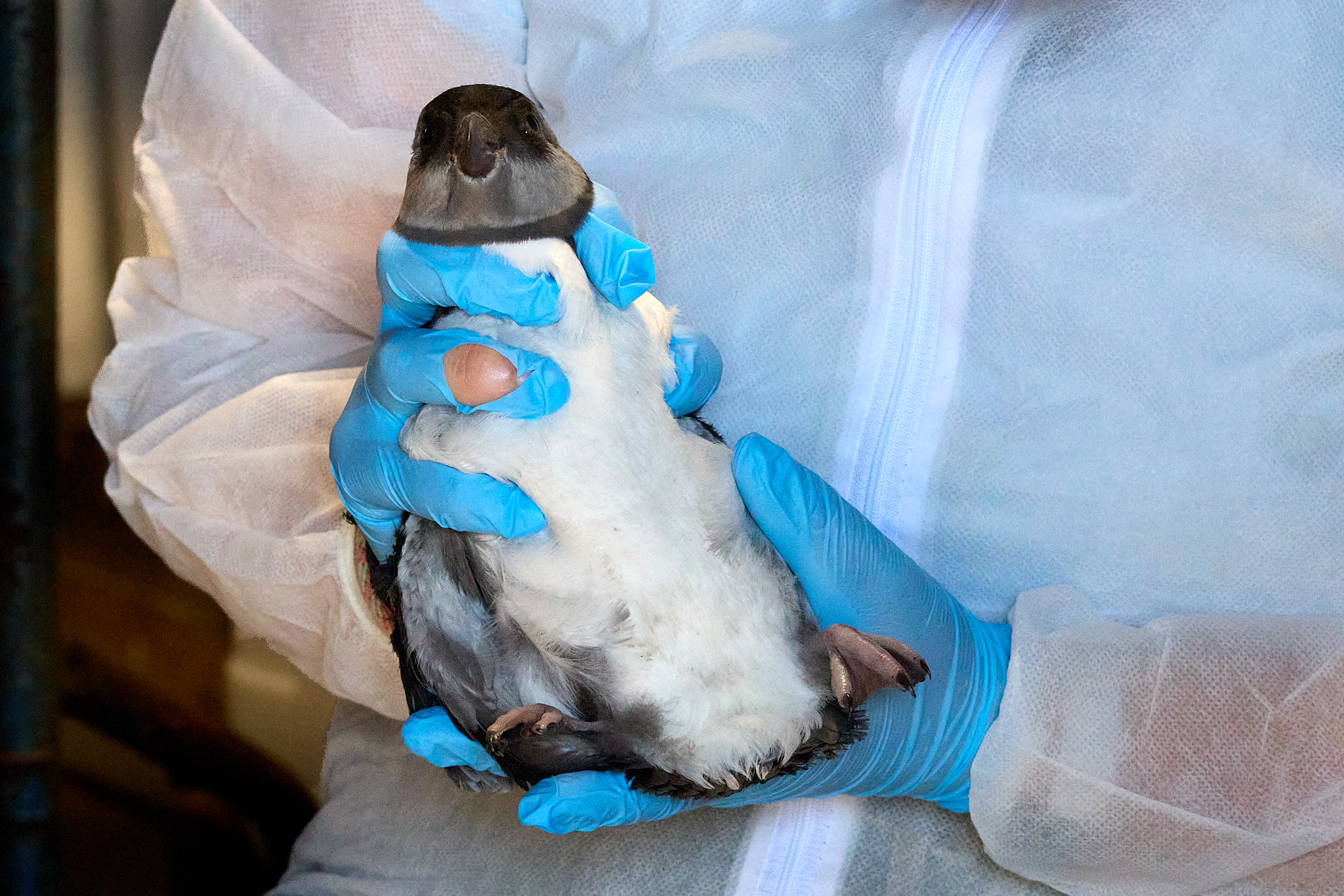 Neben mir raschelt es und die Brennnesseln bewegen sich. In der Hocke kann ich einen kleinen schwarz-weißen Körper erkennen. Aber der rührt sich nicht, hat es wohl nicht geschafft in der letzten Nacht. Aber gleich daneben schauen mich zwei Knopfaugen ängstlich an – und dann watschelt der kleine Puffling noch tiefer in das dichte Gewirr der Nesseln (die übrigens extrem unangenehm brennen, wenn man mit ihnen in Berührung kommt). Zu dritt versuchen wir von allen Seiten, den Wanderer einzukreisen. Was sich recht schwierig gestaltet, da man von oben fast nicht sieht, wo er sich gerade befindet. Doch dann bemerke ich, wie er seitlich Richtung Steinmauer „ausbrechen“ will und hechte in seine Richtung. Und das im wahrsten Sinne des Wortes, denn auf dem unebenen Untergrund komme ich ins Stolpern und lande rücklings auf meiner Kehrseite. Kurzer Schreckmoment – aber ich habe mich nicht auf den kleinen Flüchtling draufgesetzt: ängstlich kuschelt er sich direkt neben mir an die Mauer. Nachdem ich nun quasi neben ihm sitze, bekomme ich ihn auch leicht zu fassen und kann ihn in den offenen Stoffbeutel befördern, den man mir vor die Nase hält. Allerdings erwischt er mich dieses Mal doch mit den scharfen Krallen und ein blutiges Rinnsal läuft meinen Daumen hinunter. Aber ich freue mich, dass wir den kleinen Taucher erwischt haben, denn in den hohen Brennnesseln hätte er wohl nicht überlebt.