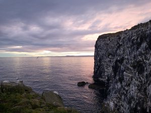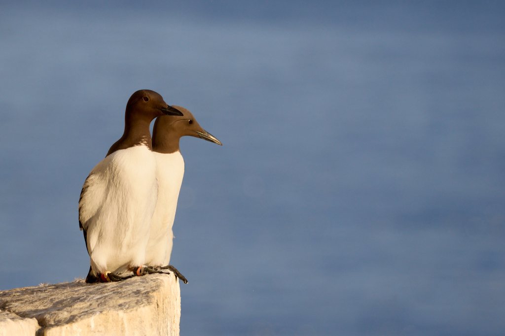 Wir haben uns einen einigermaßen windgeschützten Platz mit Blick auf den Felsen ausgesucht. Die Sonne steht schon tief über dem Horizont und taucht die Landschaft in ein weiches Licht. Ein paar Meter vor uns geht es steil nach unten: ein tiefes Tal, in dem das Rauschen der Wellen zu erahnen ist. Denn hören kann man das Meer hier nicht. Der Lärm vom gegenüberliegenden Felsen übertönt alles: Dreizehenmöwen begrüßen sich lautstark, die Trottellummen müssen wohl jedem ihrer Nachbarn die letzten Neuigkeiten einzeln erzählen und dazwischen hört man auch immer wieder die „Rah, rah!“ Rufe der Tordalks. Die steile Felswand vor uns ist dicht besetzt mit Seevögeln und ihrem Nachwuchs. Überall lugen flauschige Knäuel zwischen den Federn der Eltern hervor oder betteln hungrige Schnäbel um Futter.