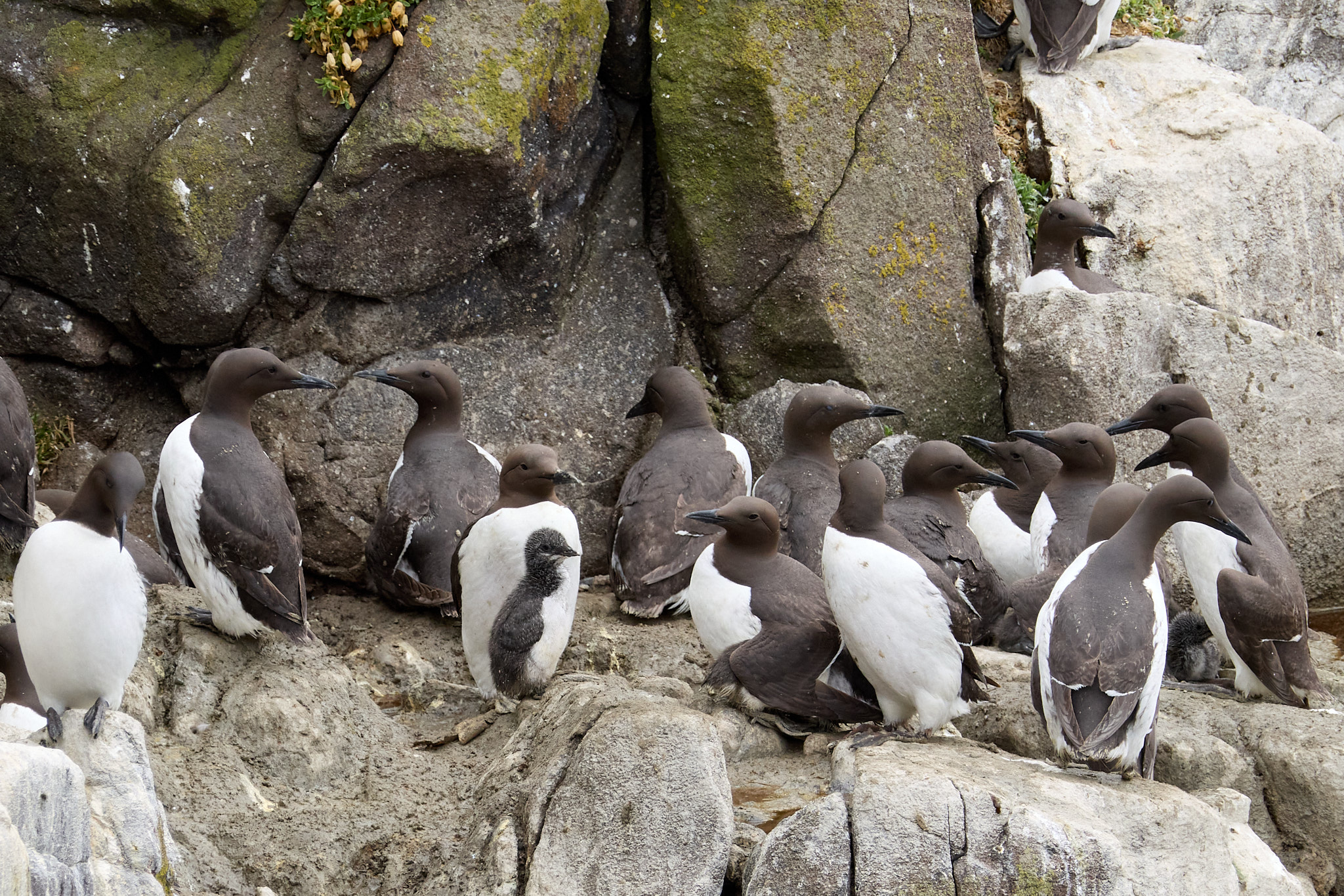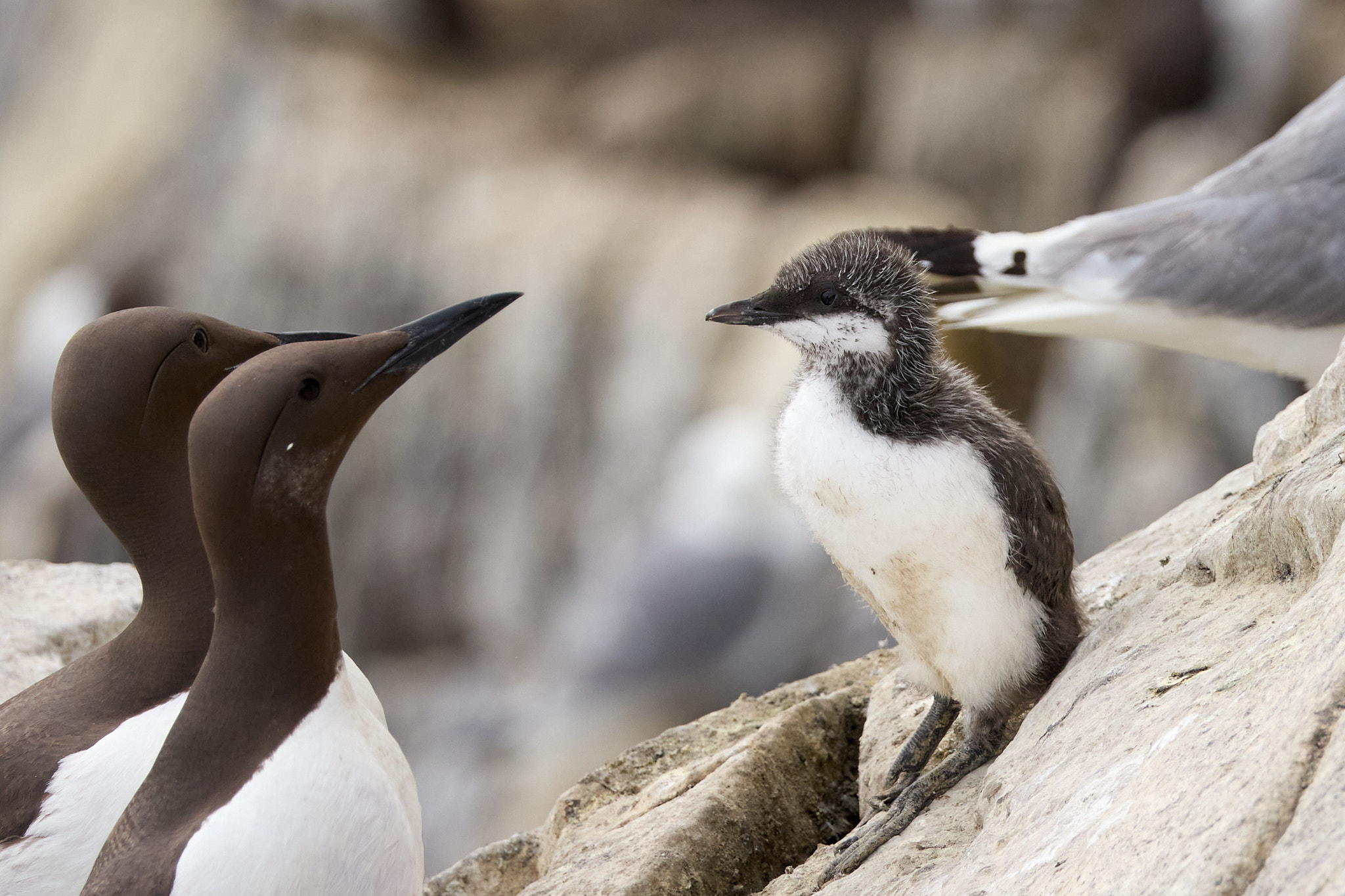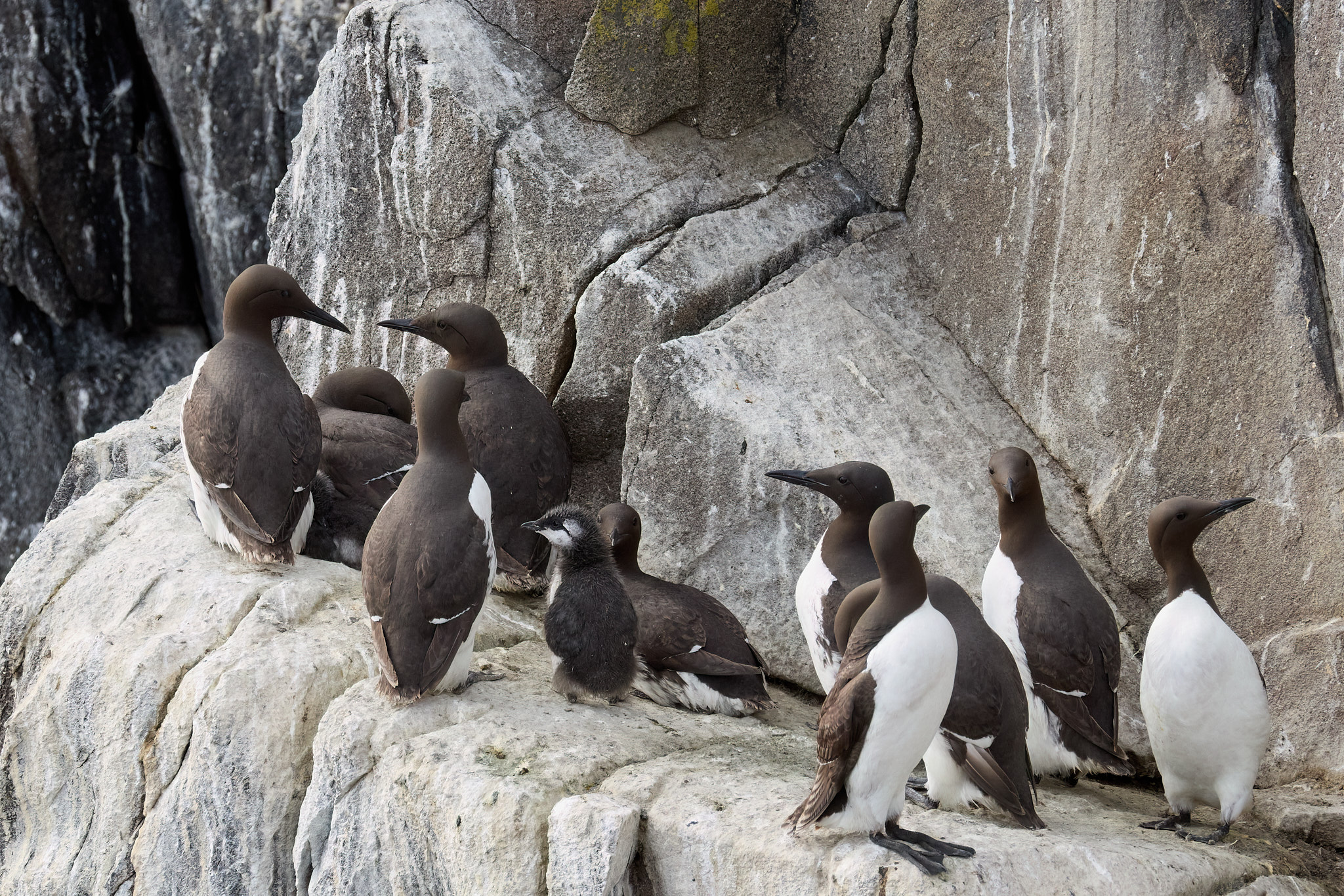 Mit unseren Ferngläsern suchen wir die Reihen von dicht gedrängten Vögeln ab. Wir sind auf der Suche nach „Sprung-Kandidaten“: kleinen Trottellummen, die bereit sind für den Sprung in Wasser. Wobei man wohl über den Ausdruck „bereit“ streiten könnte, denn wann kann man schon bereit sein für einen Sprung aus 30 Metern Höhe in ein kaltes und stürmisches Meer? Aber den Kleinen bleibt nichts anderes übrig, wenn es den Eltern zu anstrengend wird, sie in luftiger Höhe mit Nahrung zu versorgen.