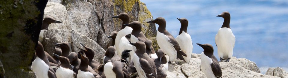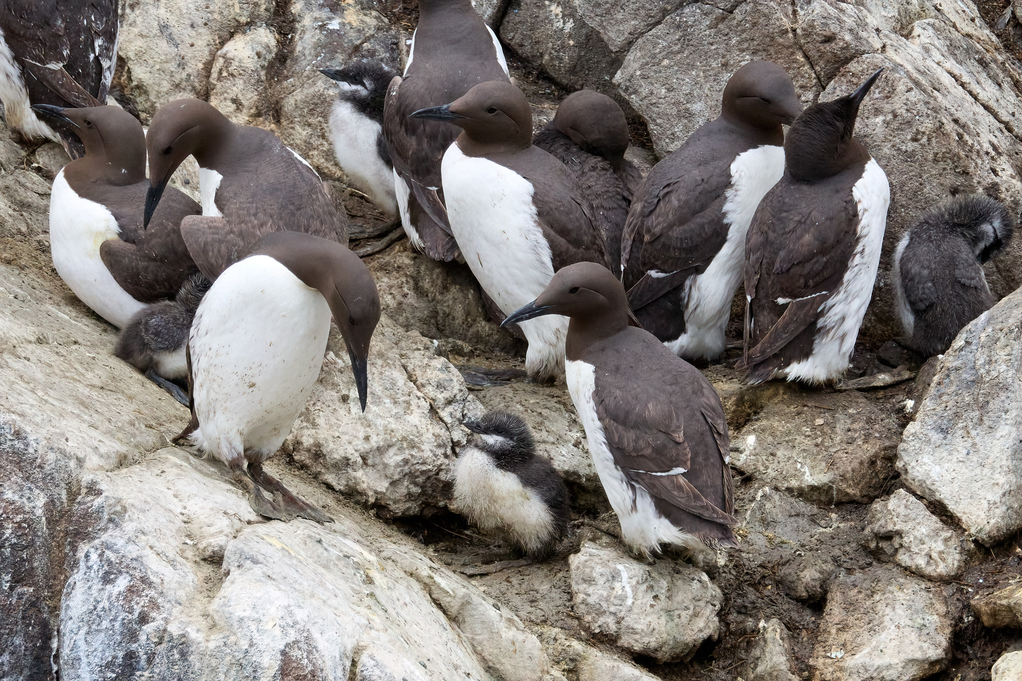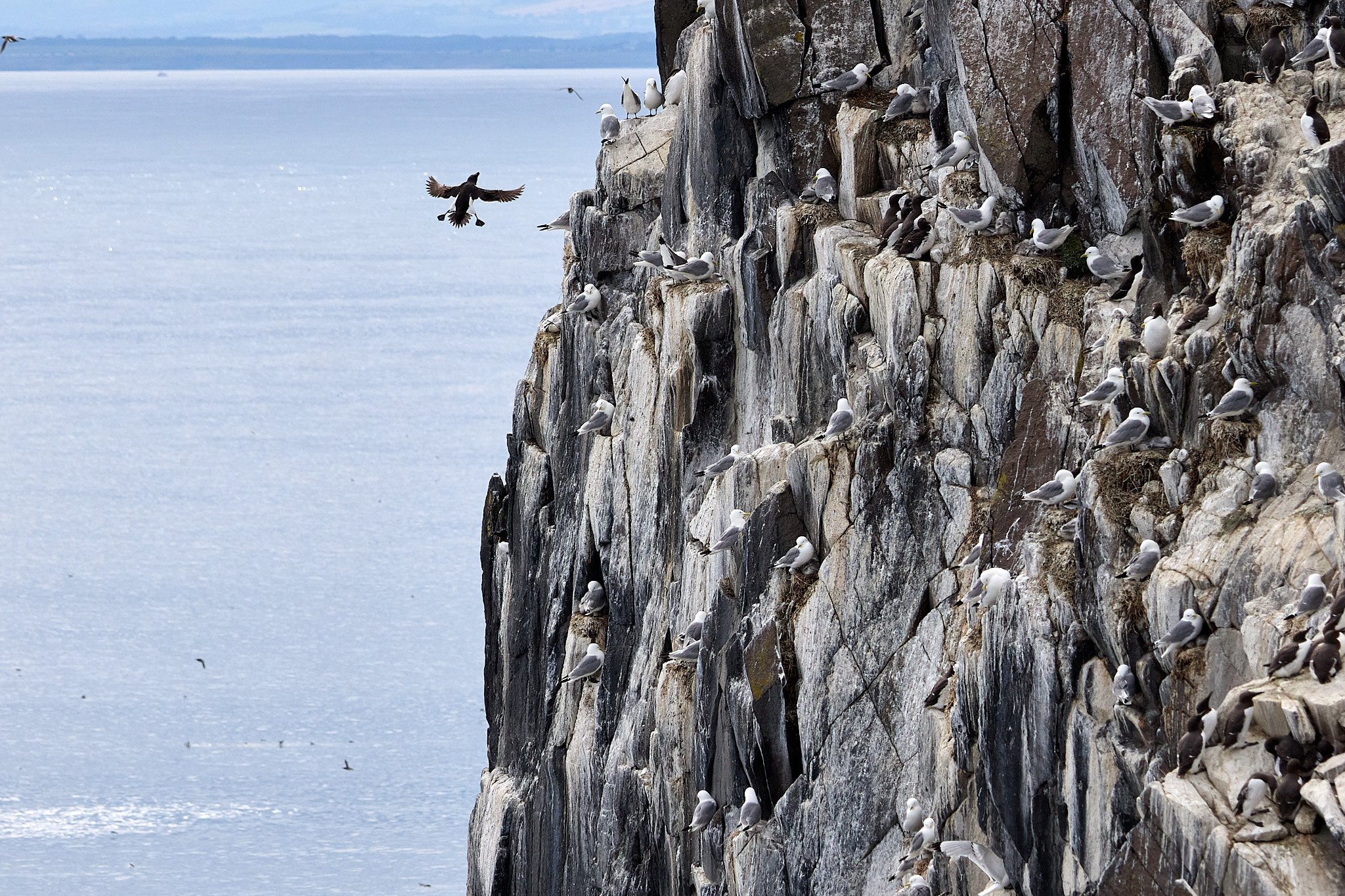 Mit unseren Ferngläsern suchen wir die Reihen von dicht gedrängten Vögeln ab. Wir sind auf der Suche nach „Sprung-Kandidaten“: kleinen Trottellummen, die bereit sind für den Sprung in Wasser. Wobei man wohl über den Ausdruck „bereit“ streiten könnte, denn wann kann man schon bereit sein für einen Sprung aus 30 Metern Höhe in ein kaltes und stürmisches Meer? Aber den Kleinen bleibt nichts anderes übrig, wenn es den Eltern zu anstrengend wird, sie in luftiger Höhe mit Nahrung zu versorgen.