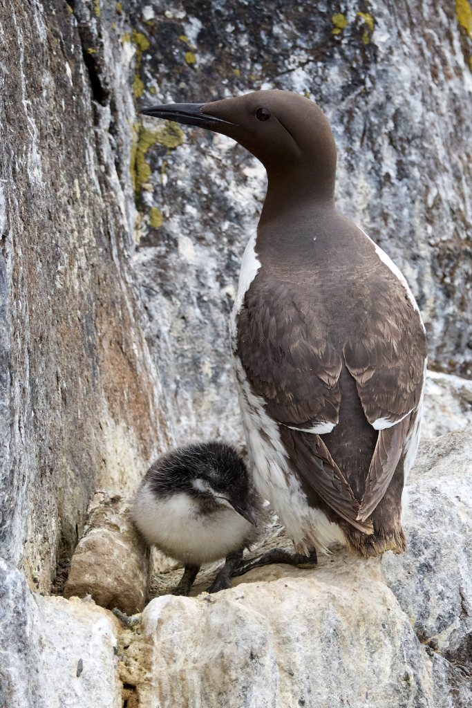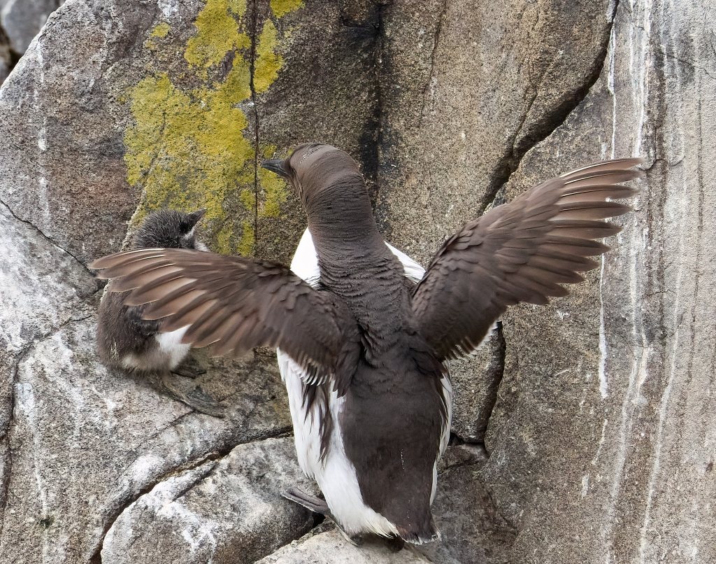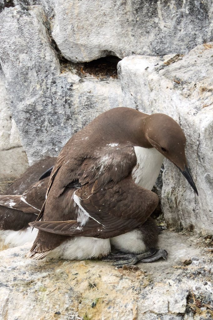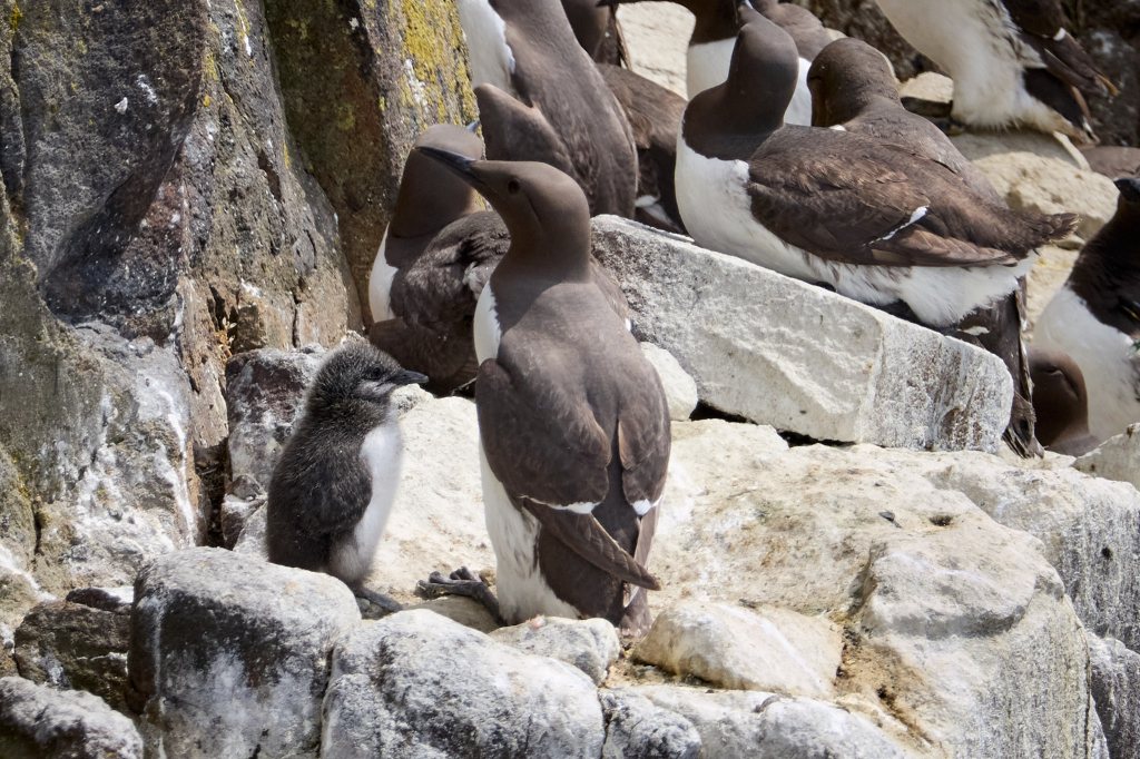 Auf einem knappen Vorsprung sitzt ein Lummenküken und schaut zweifelnd in die Tiefe. Auf dem nächsten Absatz, gut 20 cm unter ihm, sitzt ein Elternteil und versucht den Nachwuchs zu animieren, den Mini-Hopser zu ihm zu wagen. Der Kleine spreizt die noch spärlich befiederten Flügel und dreht sich dann wieder Richtung Felswand. Kurz darauf nimmt ihn die Mama wieder unter ihre Fittiche. Der ist wohl heute kein Kandidat.